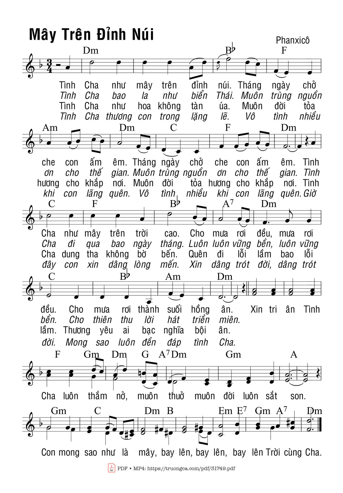 Sheet music Mây Trên Đỉnh Núi by Phanxico and PDF file was posted here to support you to practice singing perfectly. Sheets with notes and chords are for reference only, for non-commercial purposes only, not involved with earning money by buying and selling. Copyright is belong to song writer/author and copyright owner. Truongca.com do not own any copyrighted content. You can download the high-quality PDF files which contain staffs by PDF link above.