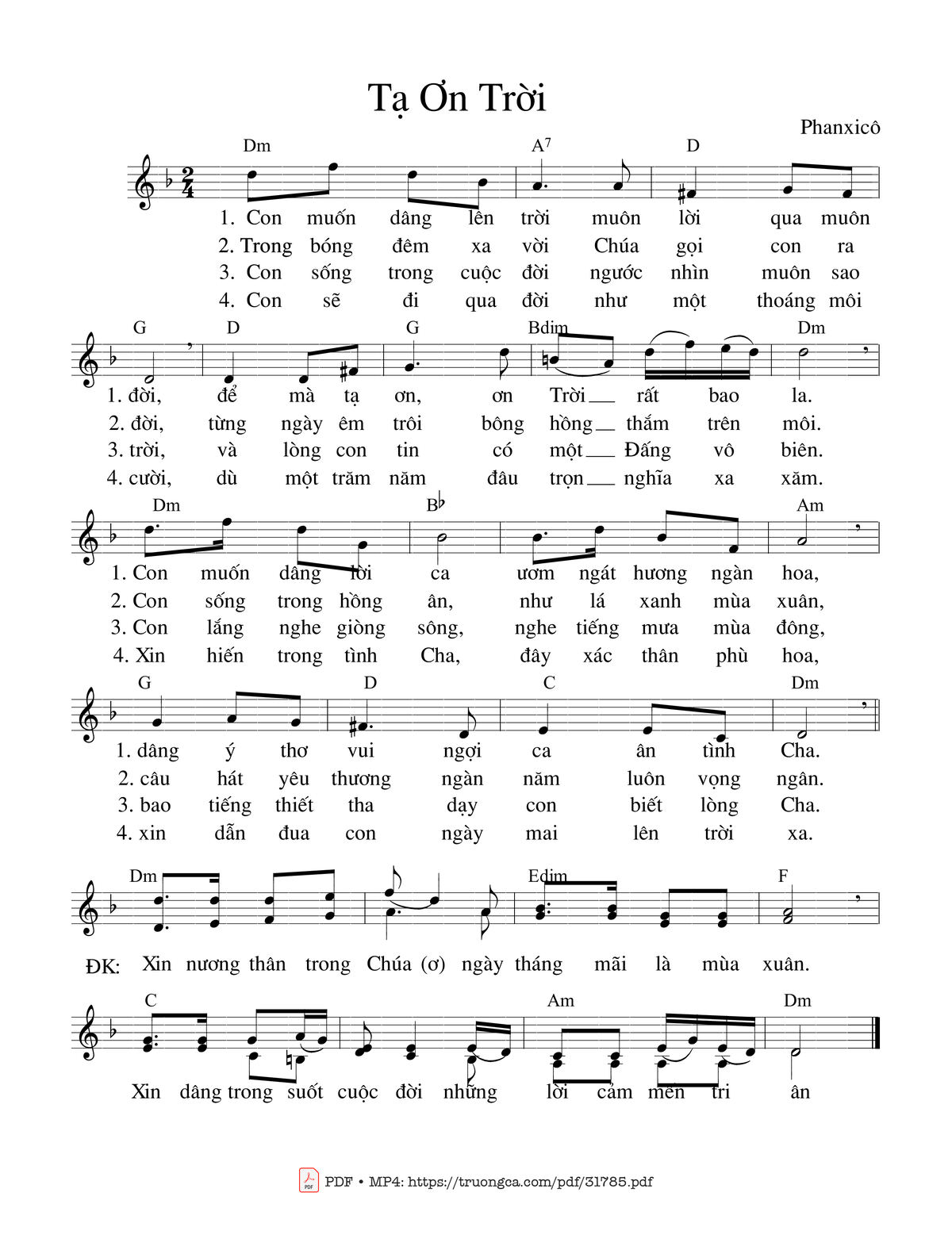 Transposition is the process of moving a song's melody and chords up or down in pitch by a constant interval. The direction of the transposition tool is indicated by a plus (+) sign for up and a minus (-) sign for down. Hover mouse over chords signs to see the chords chart of Tạ Ơn Trời song.