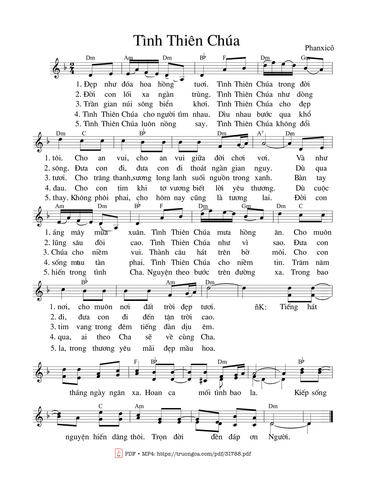 Sheet music Tình Thiên Chúa by Phanxico and PDF file was posted here to support you to practice singing perfectly. Sheets with notes and chords are for reference only, for non-commercial purposes only, not involved with earning money by buying and selling. Copyright is belong to song writer/author and copyright owner. Truongca.com do not own any copyrighted content. You can download the high-quality PDF files which contain staffs by PDF link above.
