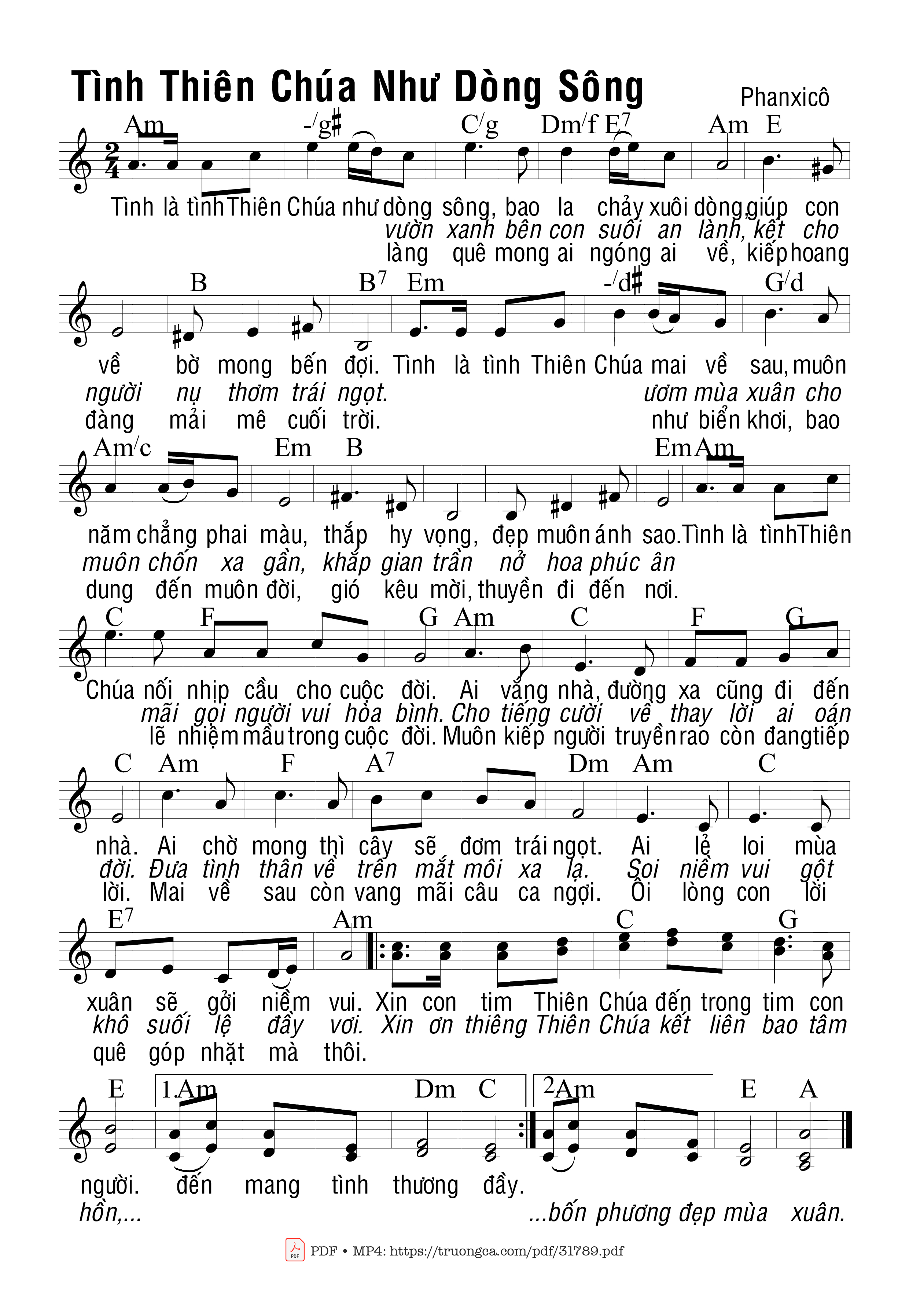 Sheet music Tình Thiên Chúa Như Dòng Sông by Phanxico and PDF file was posted here to support you to practice singing perfectly. Sheets with notes and chords are for reference only, for non-commercial purposes only, not involved with earning money by buying and selling. Copyright is belong to song writer/author and copyright owner. Truongca.com do not own any copyrighted content. You can download the high-quality PDF files which contain staffs by PDF link above.