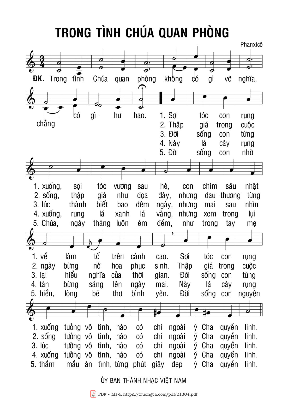 Sheet music Trông Tình Chúa Quan Phòng by Phanxico and PDF file was posted here to support you to practice singing perfectly. Sheets with notes and chords are for reference only, for non-commercial purposes only, not involved with earning money by buying and selling. Copyright is belong to song writer/author and copyright owner. Truongca.com do not own any copyrighted content. You can download the high-quality PDF files which contain staffs by PDF link above.