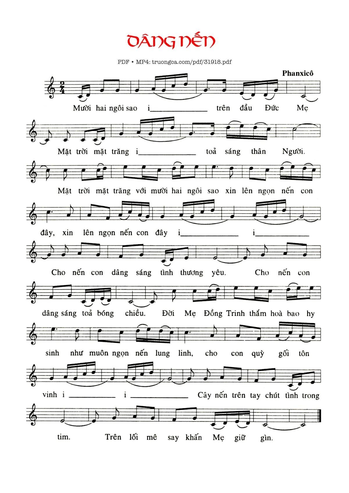 Sheet music Dâng Nến by Phanxico and PDF file was posted here to support you to practice singing perfectly. Sheets with notes and chords are for reference only, for non-commercial purposes only, not involved with earning money by buying and selling. Copyright is belong to song writer/author and copyright owner. Truongca.com do not own any copyrighted content. You can download the high-quality PDF files which contain staffs by PDF link above.