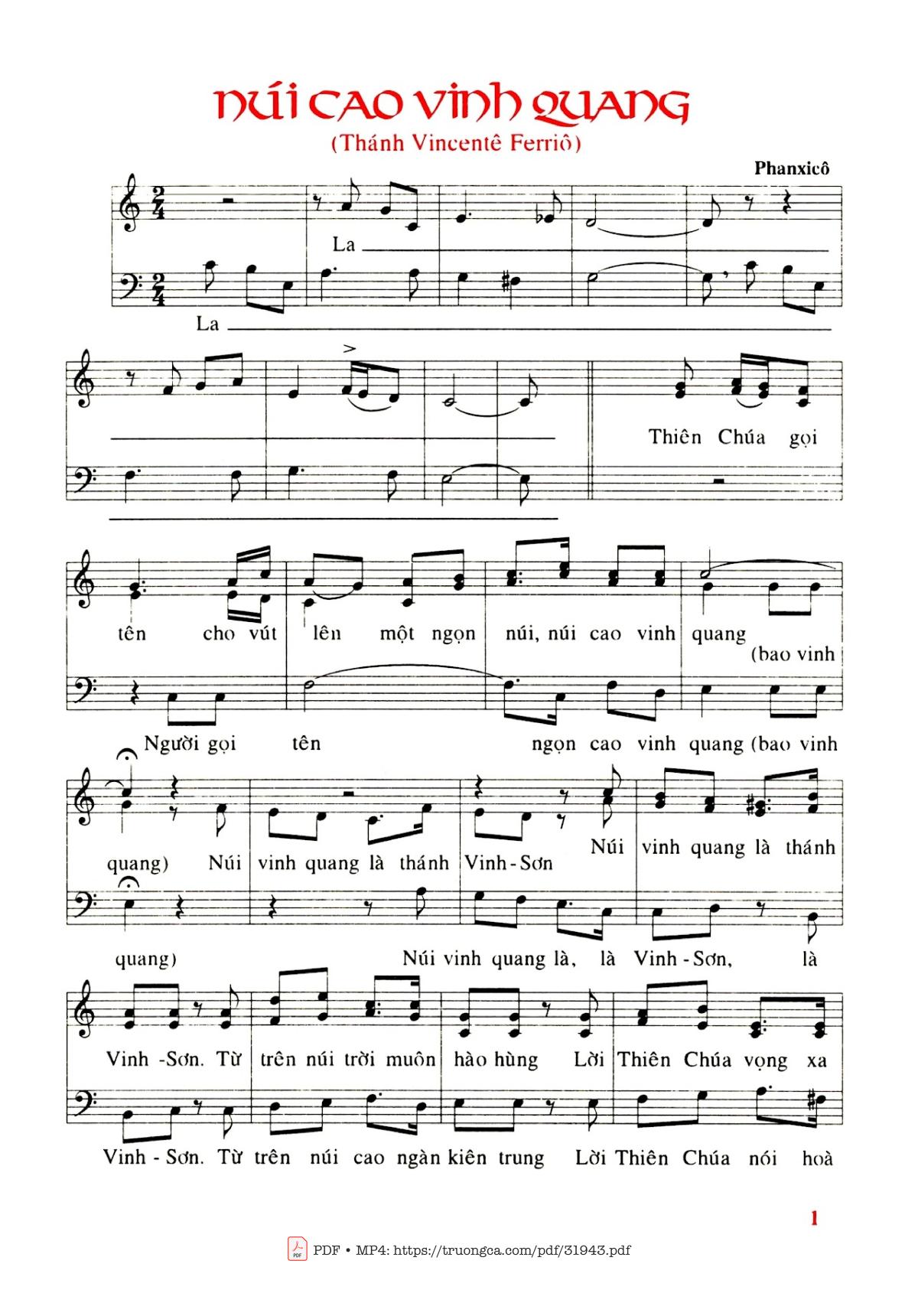 Sheet music Núi Cao Vinh Quang by Phanxico and PDF file was posted here to support you to practice singing perfectly. Sheets with notes and chords are for reference only, for non-commercial purposes only, not involved with earning money by buying and selling. Copyright is belong to song writer/author and copyright owner. Truongca.com do not own any copyrighted content. You can download the high-quality PDF files which contain staffs by PDF link above.