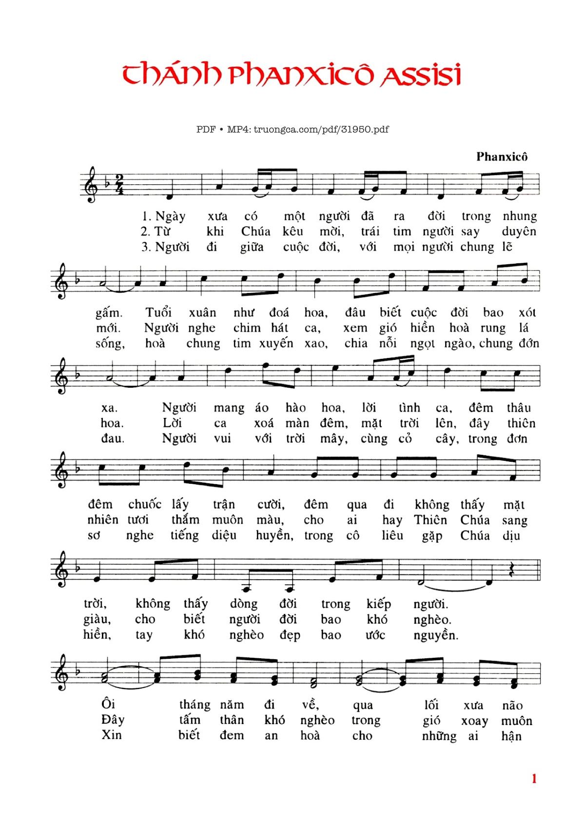 Sheet music Thánh Phanxicô Assisi by Phanxico and PDF file was posted here to support you to practice singing perfectly. Sheets with notes and chords are for reference only, for non-commercial purposes only, not involved with earning money by buying and selling. Copyright is belong to song writer/author and copyright owner. Truongca.com do not own any copyrighted content. You can download the high-quality PDF files which contain staffs by PDF link above.