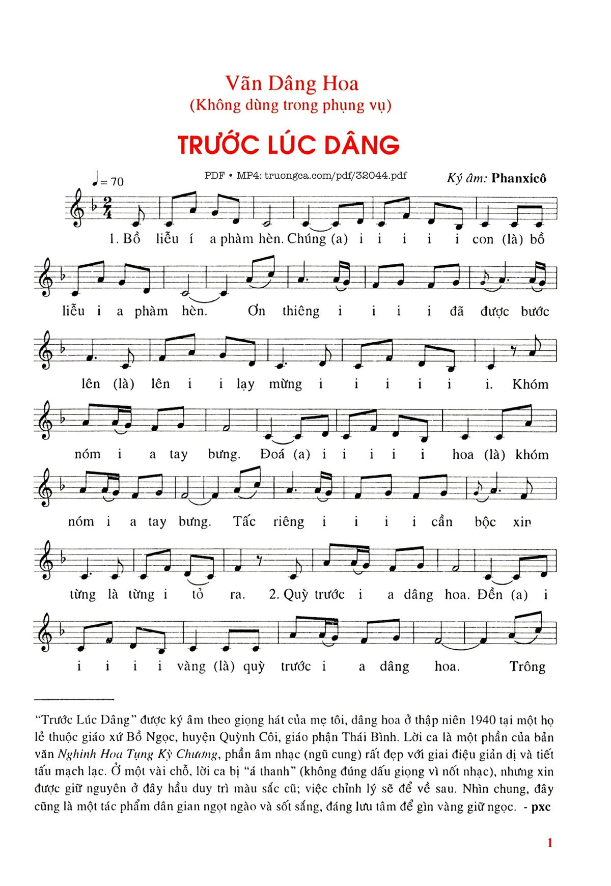 Sheet music Trước Lúc Dâng by Phanxico and PDF file was posted here to support you to practice singing perfectly. Sheets with notes and chords are for reference only, for non-commercial purposes only, not involved with earning money by buying and selling. Copyright is belong to song writer/author and copyright owner. Truongca.com do not own any copyrighted content. You can download the high-quality PDF files which contain staffs by PDF link above.