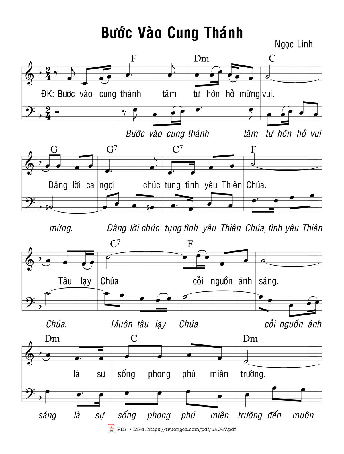 Sheet music Bước Vào Cung Thánh 2 by Ngọc Linh and PDF file was posted here to support you to practice singing perfectly. Sheets with notes and chords are for reference only, for non-commercial purposes only, not involved with earning money by buying and selling. Copyright is belong to song writer/author and copyright owner. Truongca.com do not own any copyrighted content. You can download the high-quality PDF files which contain staffs by PDF link above.