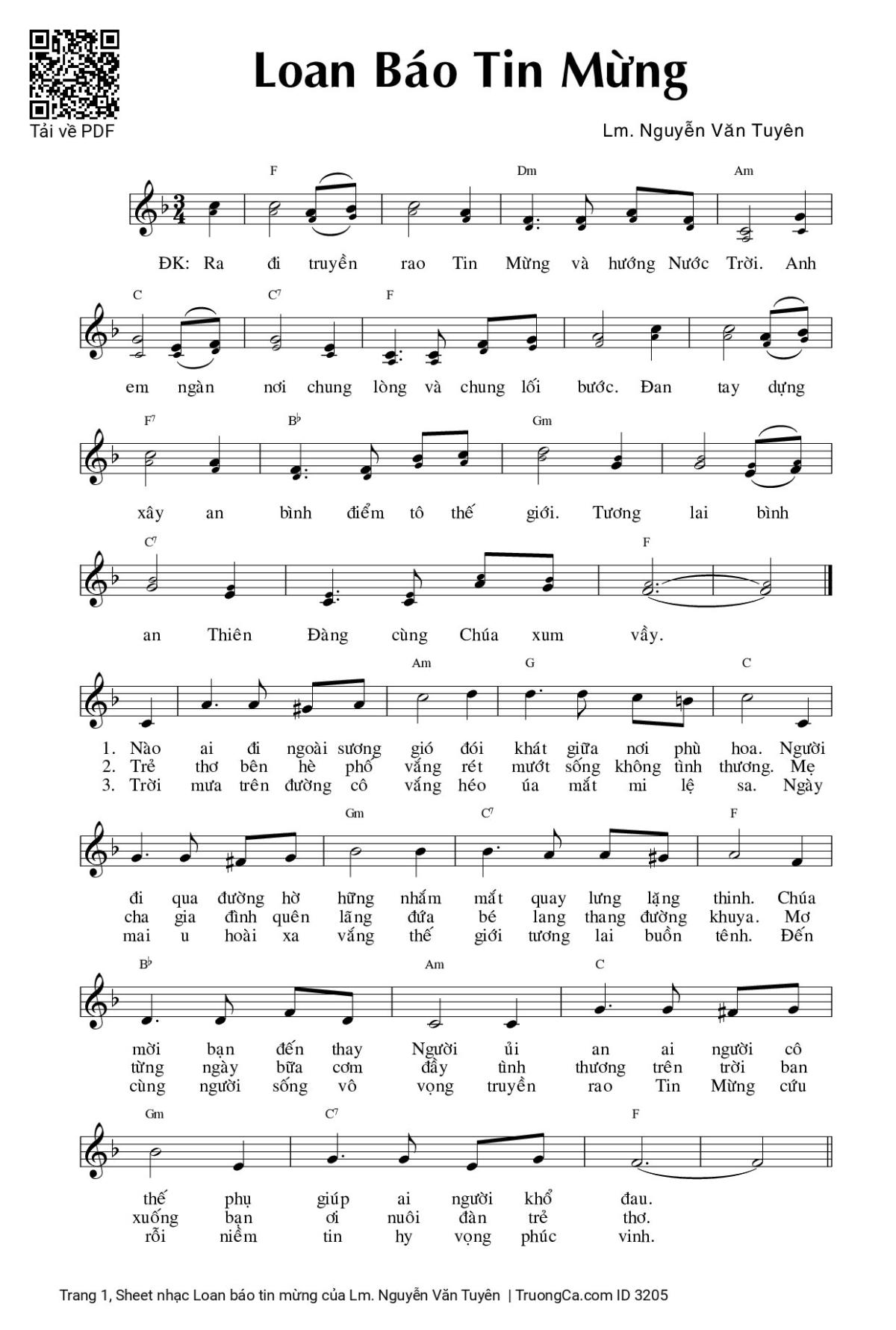 Transposition is the process of moving a song's melody and chords up or down in pitch by a constant interval. The direction of the transposition tool is indicated by a plus (+) sign for up and a minus (-) sign for down. Hover mouse over chords signs to see the chords chart of Loan báo tin mừng song.