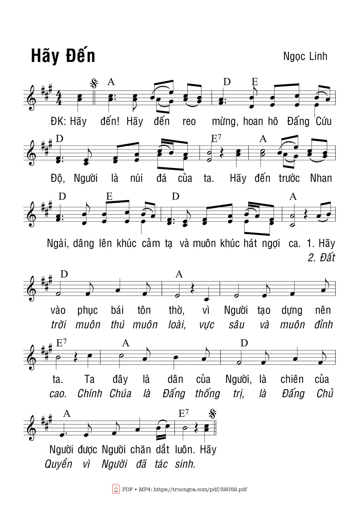 Sheet music Hãy Đến by Ngọc Linh and PDF file was posted here to support you to practice singing perfectly. Sheets with notes and chords are for reference only, for non-commercial purposes only, not involved with earning money by buying and selling. Copyright is belong to song writer/author and copyright owner. Truongca.com do not own any copyrighted content. You can download the high-quality PDF files which contain staffs by PDF link above.