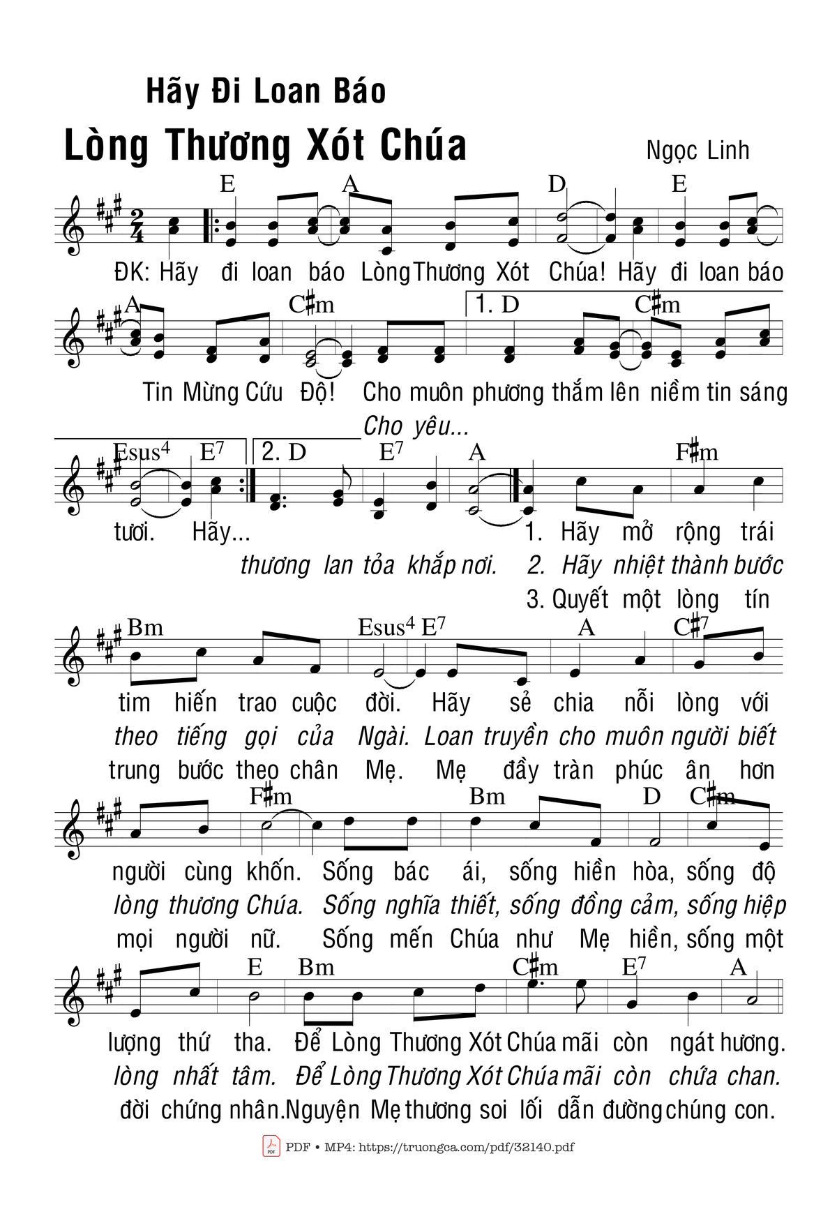Sheet music Hãy Đi Loan Báo Ltxc by Ngọc Linh and PDF file was posted here to support you to practice singing perfectly. Sheets with notes and chords are for reference only, for non-commercial purposes only, not involved with earning money by buying and selling. Copyright is belong to song writer/author and copyright owner. Truongca.com do not own any copyrighted content. You can download the high-quality PDF files which contain staffs by PDF link above.