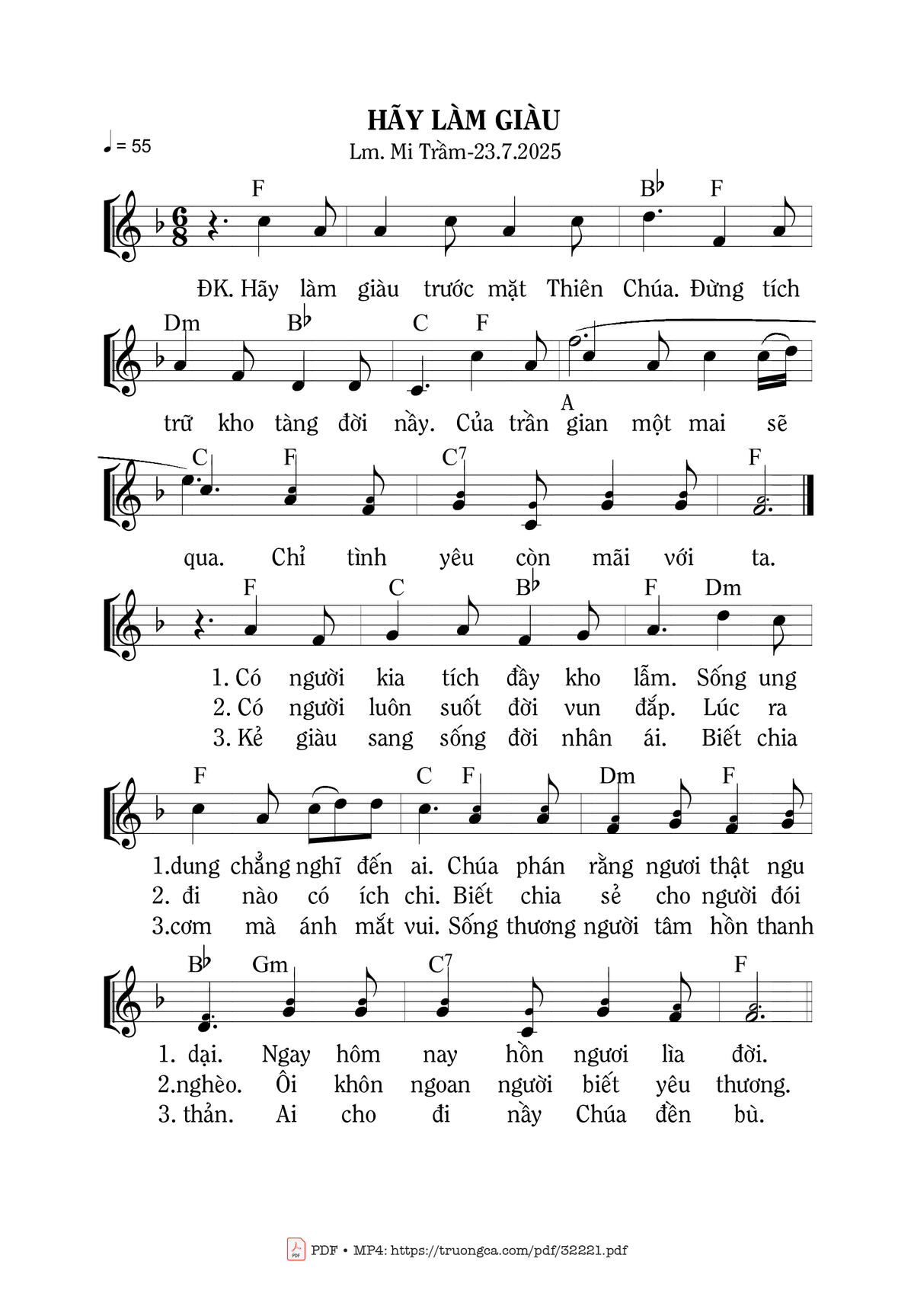 Điệp khúc. Hãy làm giàu trước mặt Thiên Chúa . Đừng tích lũy kho tàng đời này. Của trần gian một mai sẽ qua. Chỉ tình yêu còn mãi với ta.