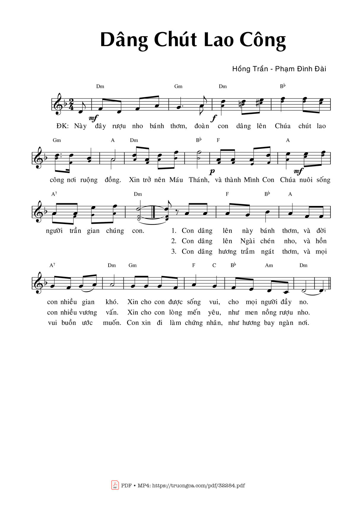 Transposition is the process of moving a song's melody and chords up or down in pitch by a constant interval. The direction of the transposition tool is indicated by a plus (+) sign for up and a minus (-) sign for down. Hover mouse over chords signs to see the chords chart of Dâng Chút Lao Công song.