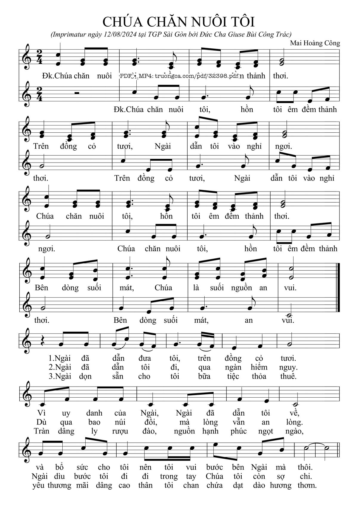 Sheet music Chúa Chăn Nuôi Tôi by Mai Hoàng Công and PDF file was posted here to support you to practice singing perfectly. Sheets with notes and chords are for reference only, for non-commercial purposes only, not involved with earning money by buying and selling. Copyright is belong to song writer/author and copyright owner. Truongca.com do not own any copyrighted content. You can download the high-quality PDF files which contain staffs by PDF link above.