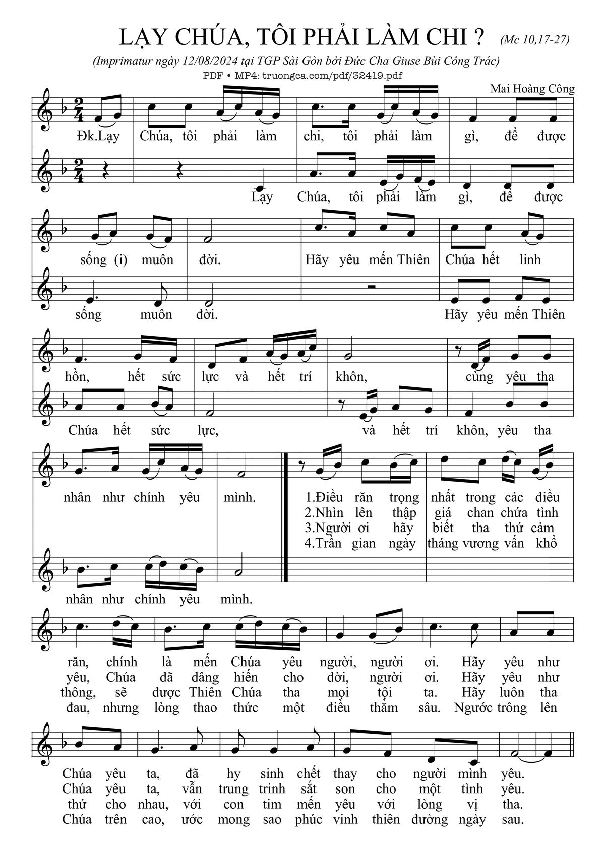 Sheet music Lạy Chúa Tôi Phải Làm Chi by Mai Hoàng Công and PDF file was posted here to support you to practice singing perfectly. Sheets with notes and chords are for reference only, for non-commercial purposes only, not involved with earning money by buying and selling. Copyright is belong to song writer/author and copyright owner. Truongca.com do not own any copyrighted content. You can download the high-quality PDF files which contain staffs by PDF link above.