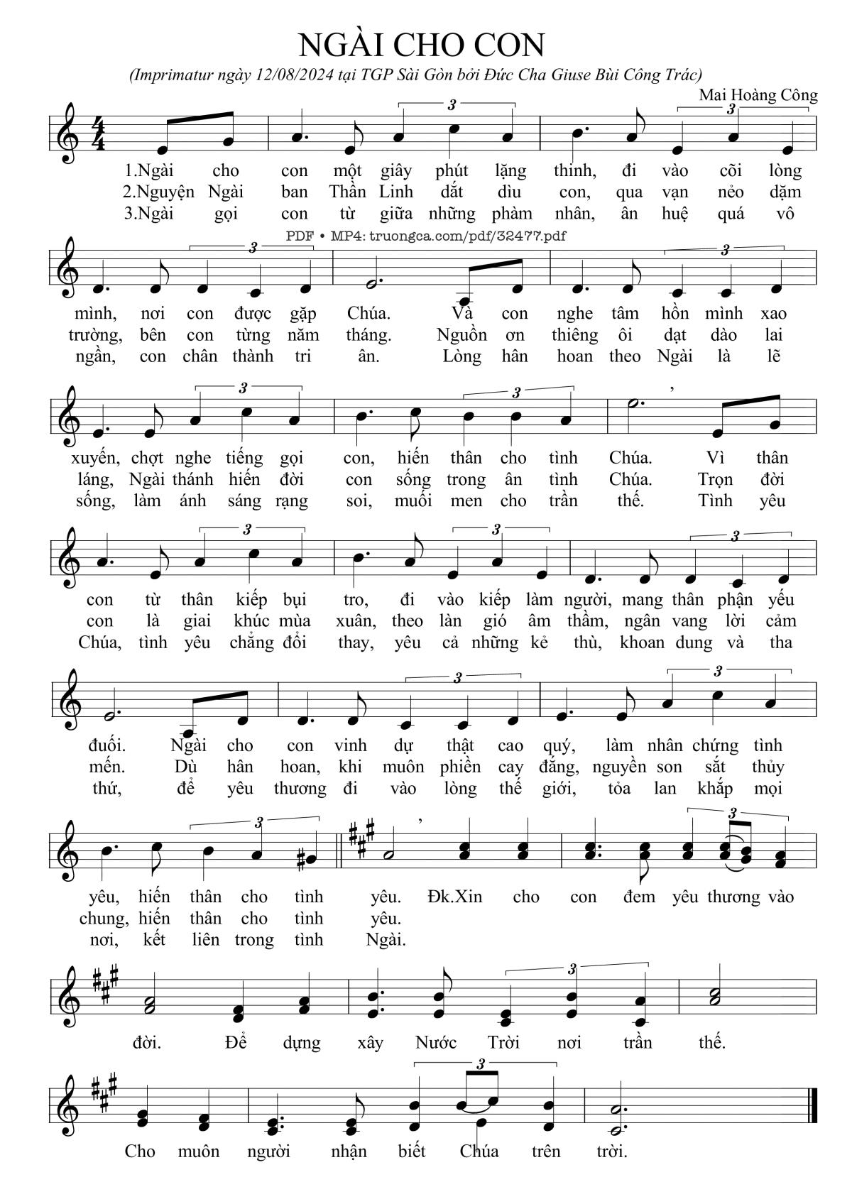 Sheet music Ngài Cho Con by Mai Hoàng Công and PDF file was posted here to support you to practice singing perfectly. Sheets with notes and chords are for reference only, for non-commercial purposes only, not involved with earning money by buying and selling. Copyright is belong to song writer/author and copyright owner. Truongca.com do not own any copyrighted content. You can download the high-quality PDF files which contain staffs by PDF link above.