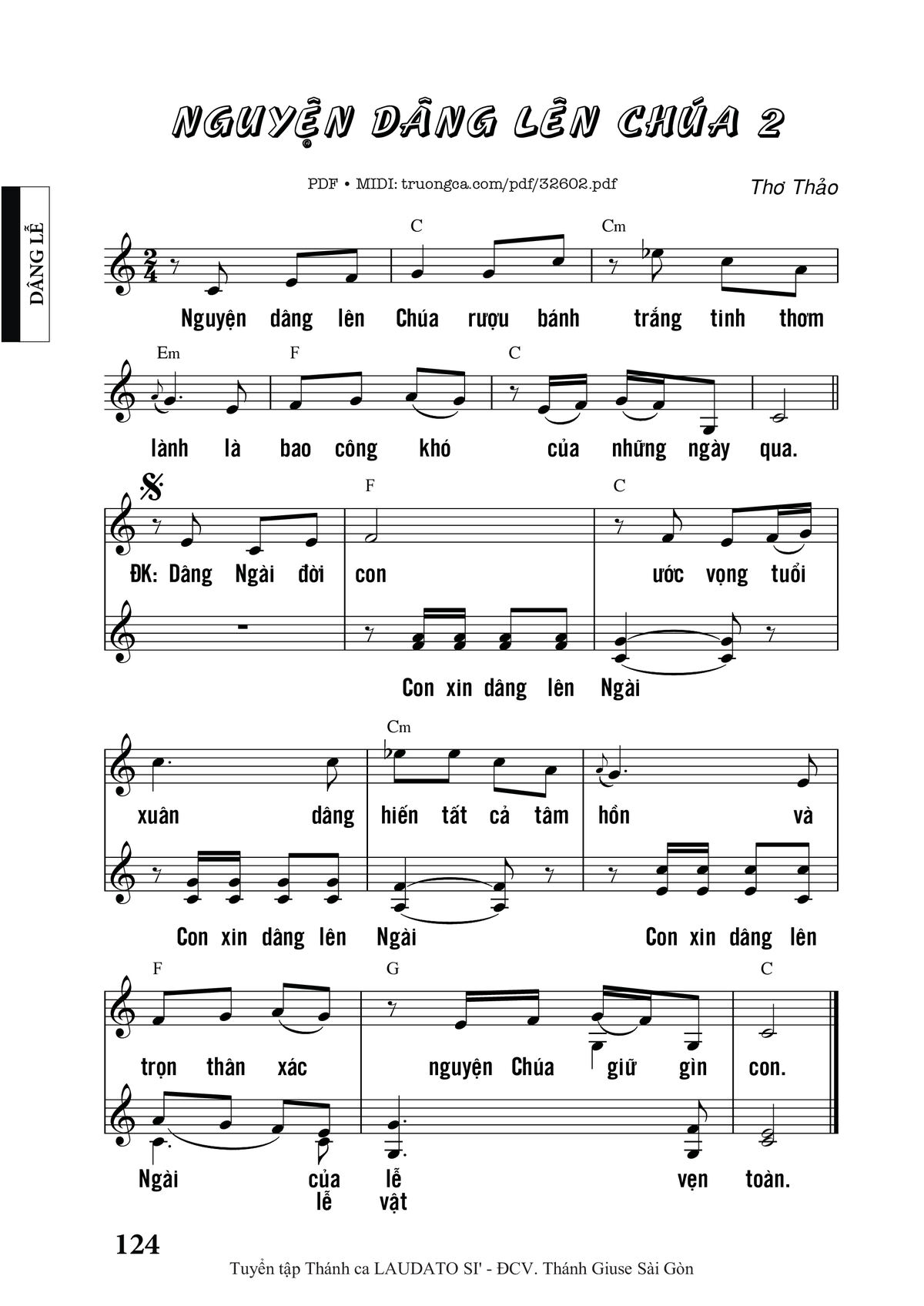 Sheet music Nguyện Dâng Lên Chúa 2 by Thơ Thảo and PDF file was posted here to support you to practice singing perfectly. Sheets with notes and chords are for reference only, for non-commercial purposes only, not involved with earning money by buying and selling. Copyright is belong to song writer/author and copyright owner. Truongca.com do not own any copyrighted content. You can download the high-quality PDF files which contain staffs by PDF link above.
