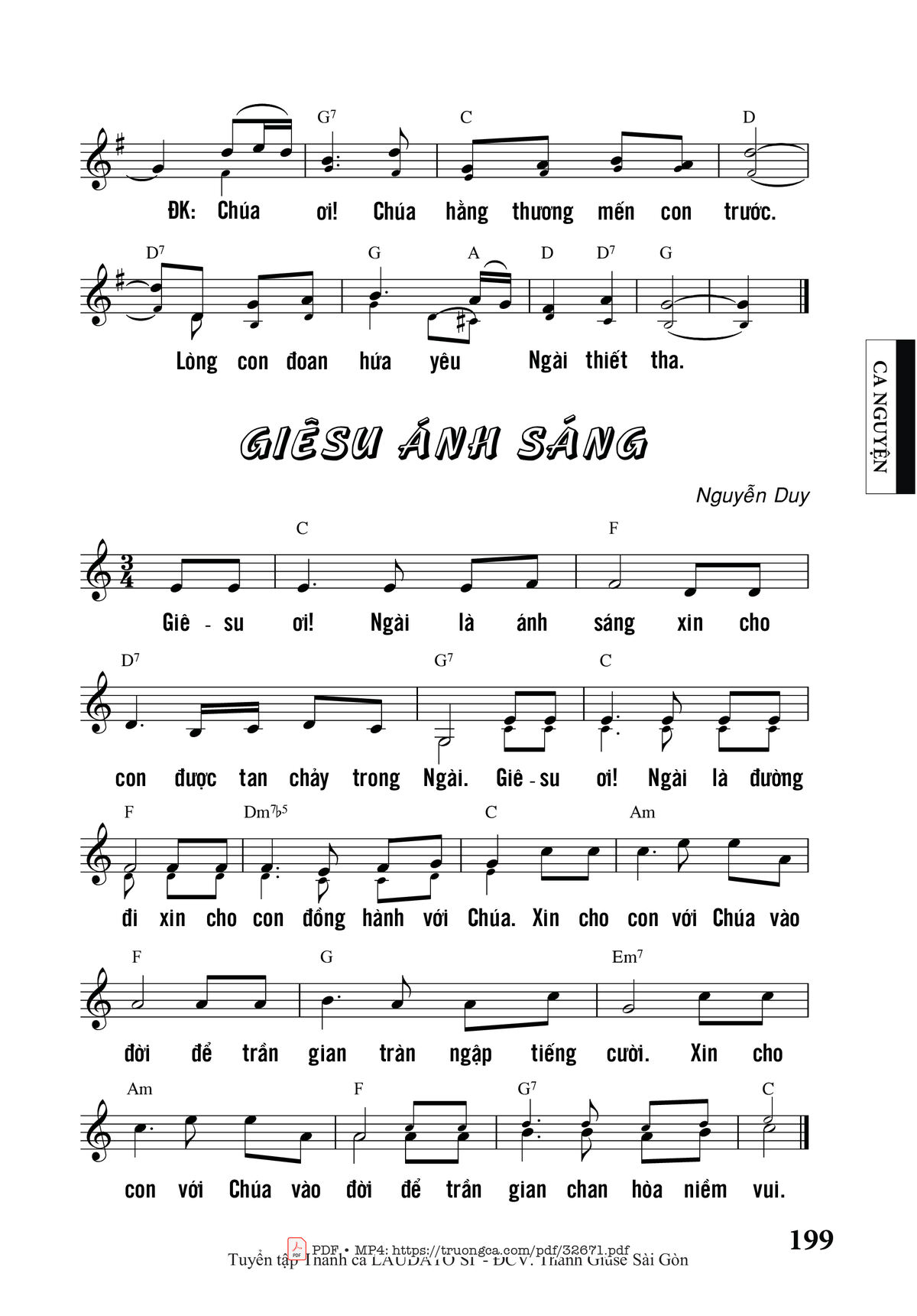 Sheet music Giêsu Ánh Sáng by Nguyễn Duy and PDF file was posted here to support you to practice singing perfectly. Sheets with notes and chords are for reference only, for non-commercial purposes only, not involved with earning money by buying and selling. Copyright is belong to song writer/author and copyright owner. Truongca.com do not own any copyrighted content. You can download the high-quality PDF files which contain staffs by PDF link above.