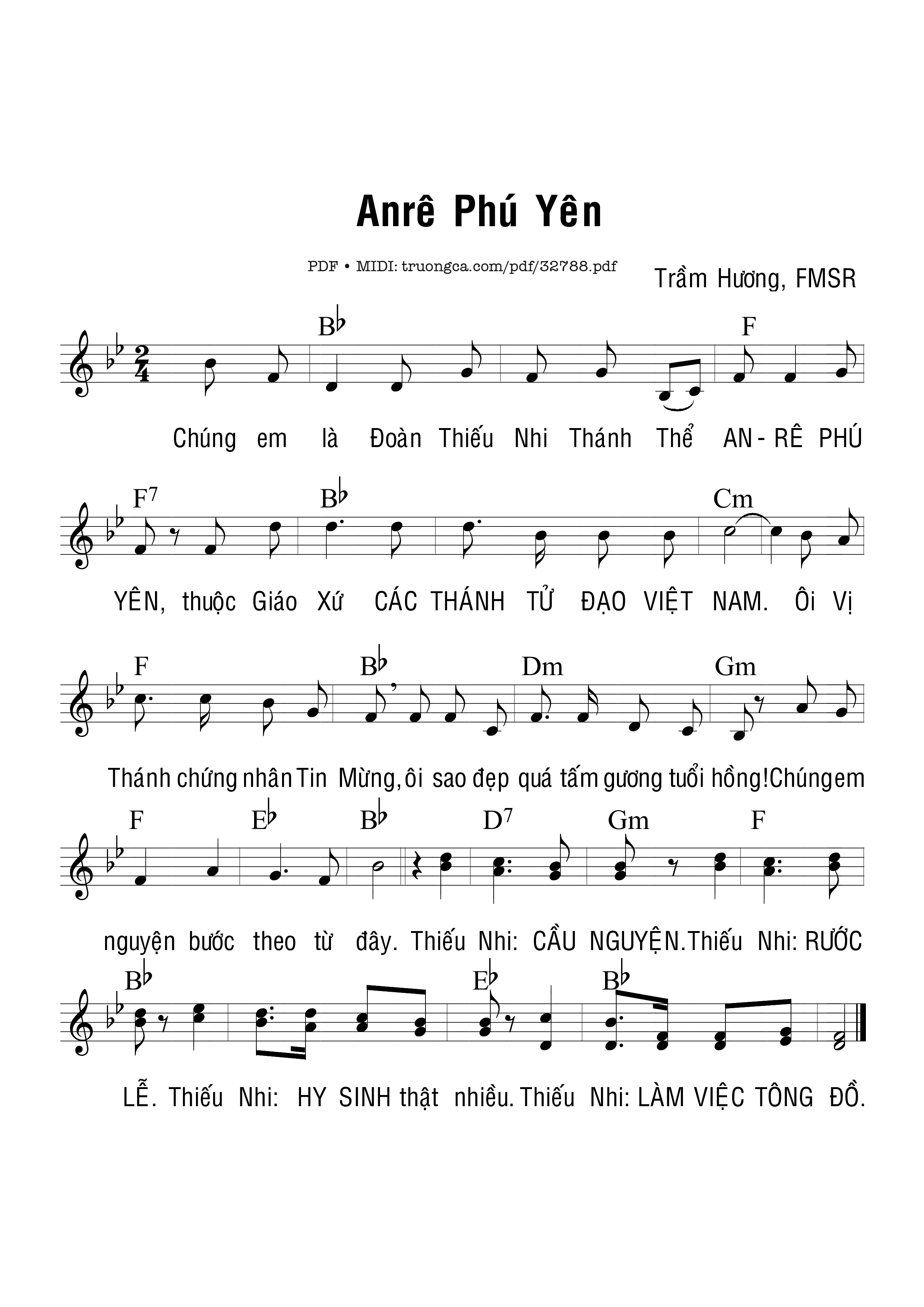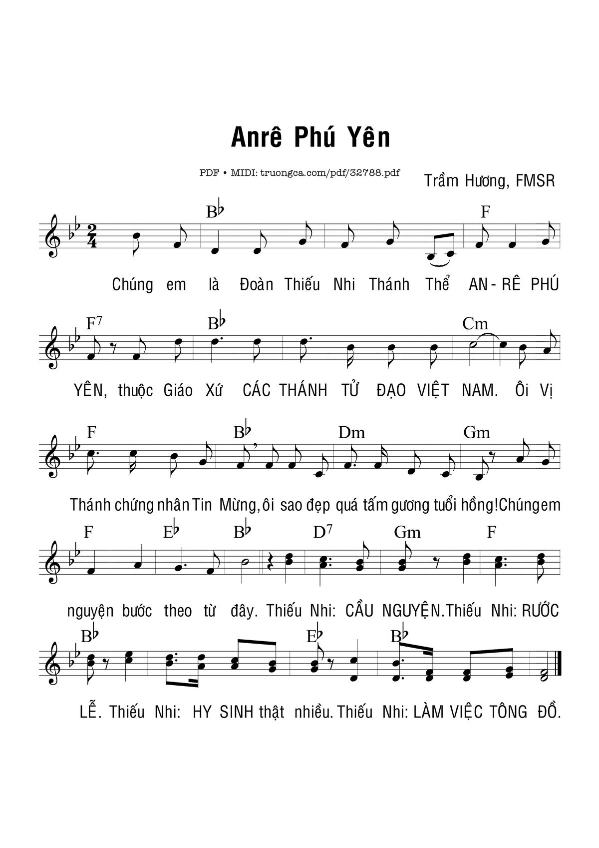 Sheet music An-Rê Phú Yên by Trầm Hương and PDF file was posted here to support you to practice singing perfectly. Sheets with notes and chords are for reference only, for non-commercial purposes only, not involved with earning money by buying and selling. Copyright is belong to song writer/author and copyright owner. Truongca.com do not own any copyrighted content. You can download the high-quality PDF files which contain staffs by PDF link above.