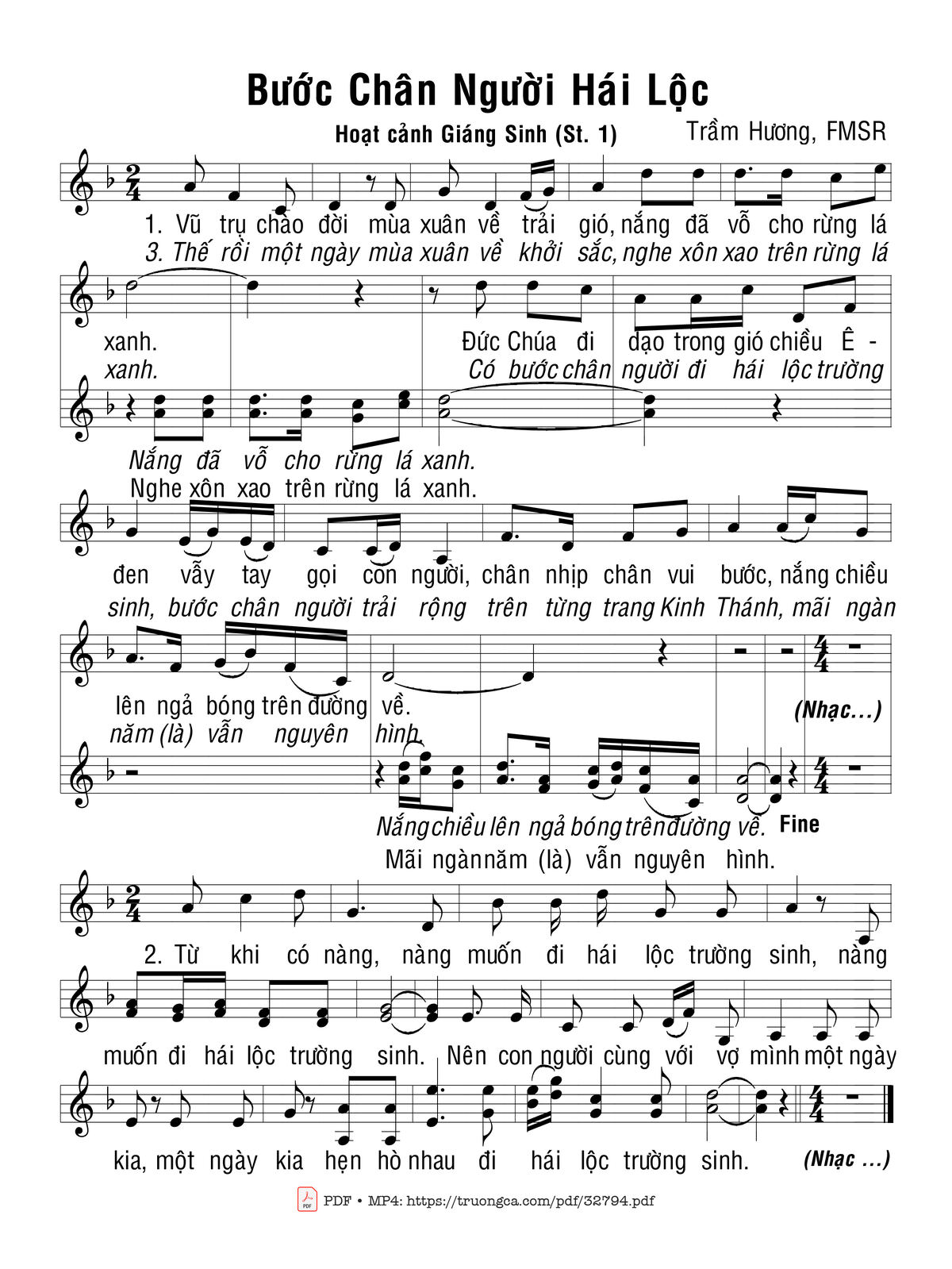 Sheet music Bước Chân Người Hái Lộc by Trầm Hương and PDF file was posted here to support you to practice singing perfectly. Sheets with notes and chords are for reference only, for non-commercial purposes only, not involved with earning money by buying and selling. Copyright is belong to song writer/author and copyright owner. Truongca.com do not own any copyrighted content. You can download the high-quality PDF files which contain staffs by PDF link above.