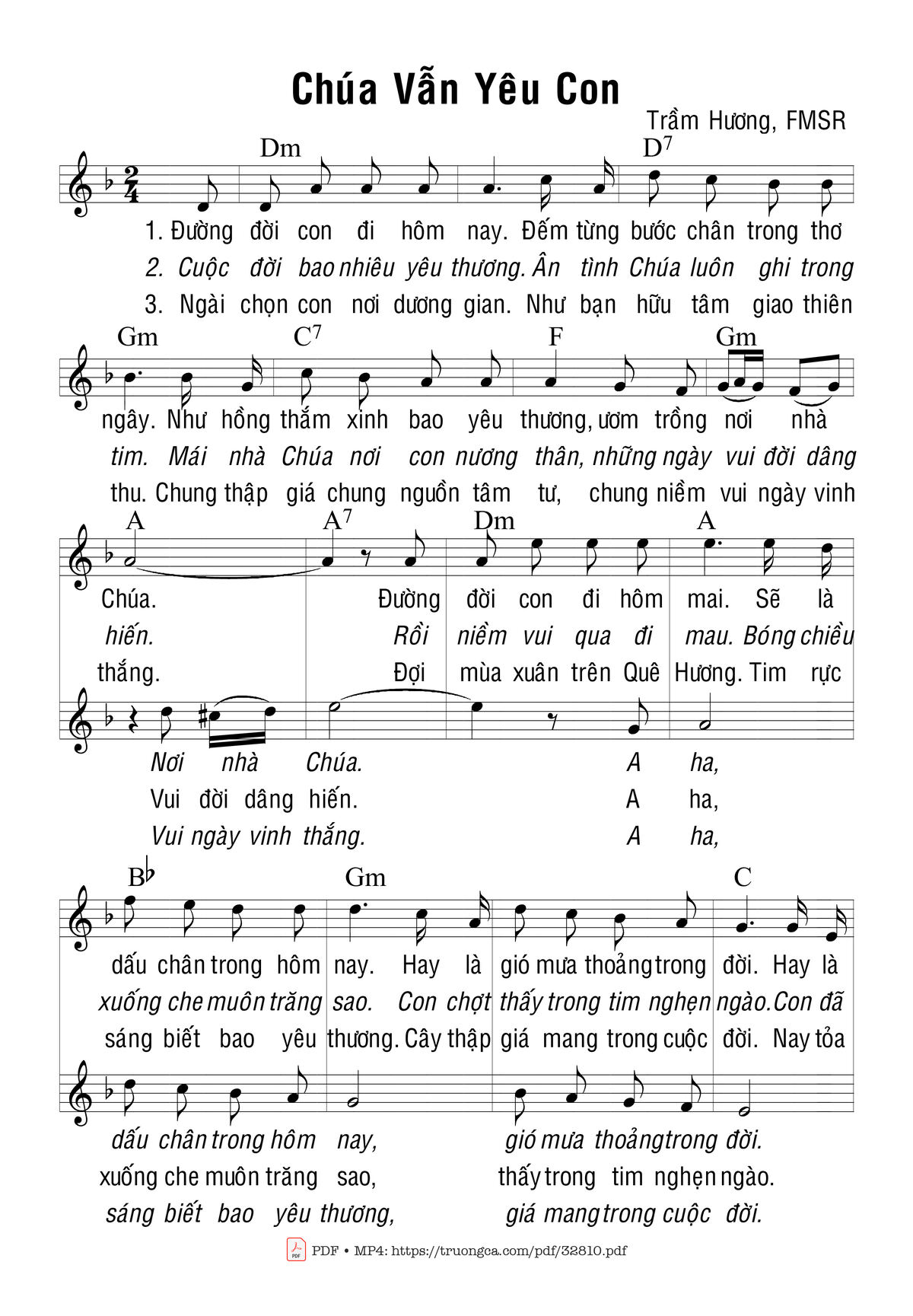 Sheet music Chúa Vẫn Yêu Con by Trầm Hương and PDF file was posted here to support you to practice singing perfectly. Sheets with notes and chords are for reference only, for non-commercial purposes only, not involved with earning money by buying and selling. Copyright is belong to song writer/author and copyright owner. Truongca.com do not own any copyrighted content. You can download the high-quality PDF files which contain staffs by PDF link above.