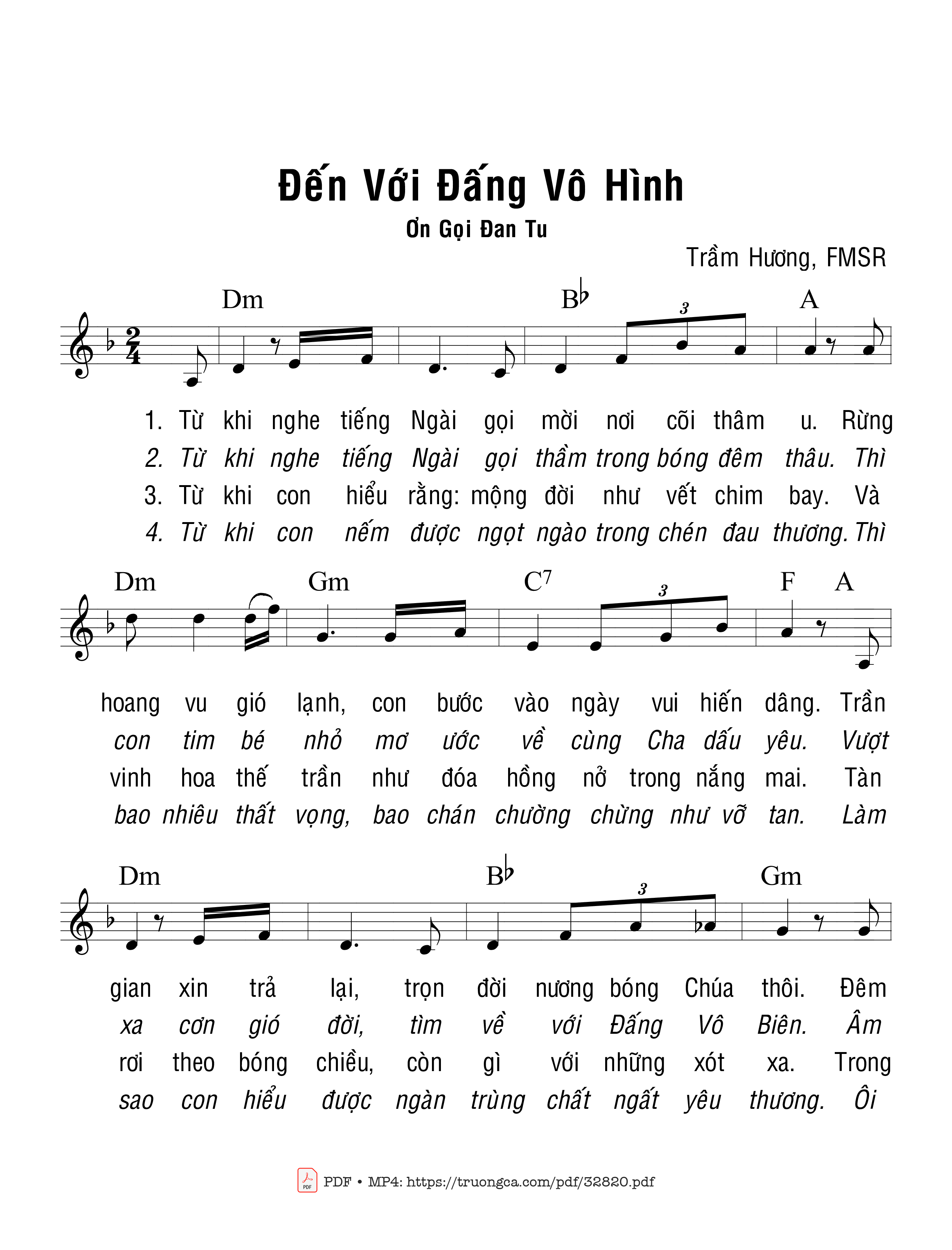 Sheet music Đến Với Đấng Vô Hình by Trầm Hương and PDF file was posted here to support you to practice singing perfectly. Sheets with notes and chords are for reference only, for non-commercial purposes only, not involved with earning money by buying and selling. Copyright is belong to song writer/author and copyright owner. Truongca.com do not own any copyrighted content. You can download the high-quality PDF files which contain staffs by PDF link above.