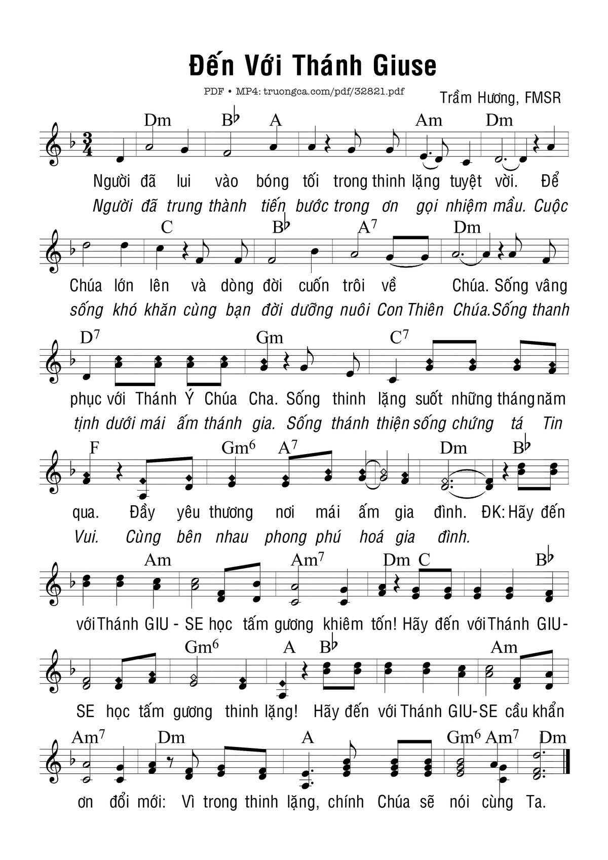 Sheet music Đến Với Thánh Giuse by Trầm Hương and PDF file was posted here to support you to practice singing perfectly. Sheets with notes and chords are for reference only, for non-commercial purposes only, not involved with earning money by buying and selling. Copyright is belong to song writer/author and copyright owner. Truongca.com do not own any copyrighted content. You can download the high-quality PDF files which contain staffs by PDF link above.
