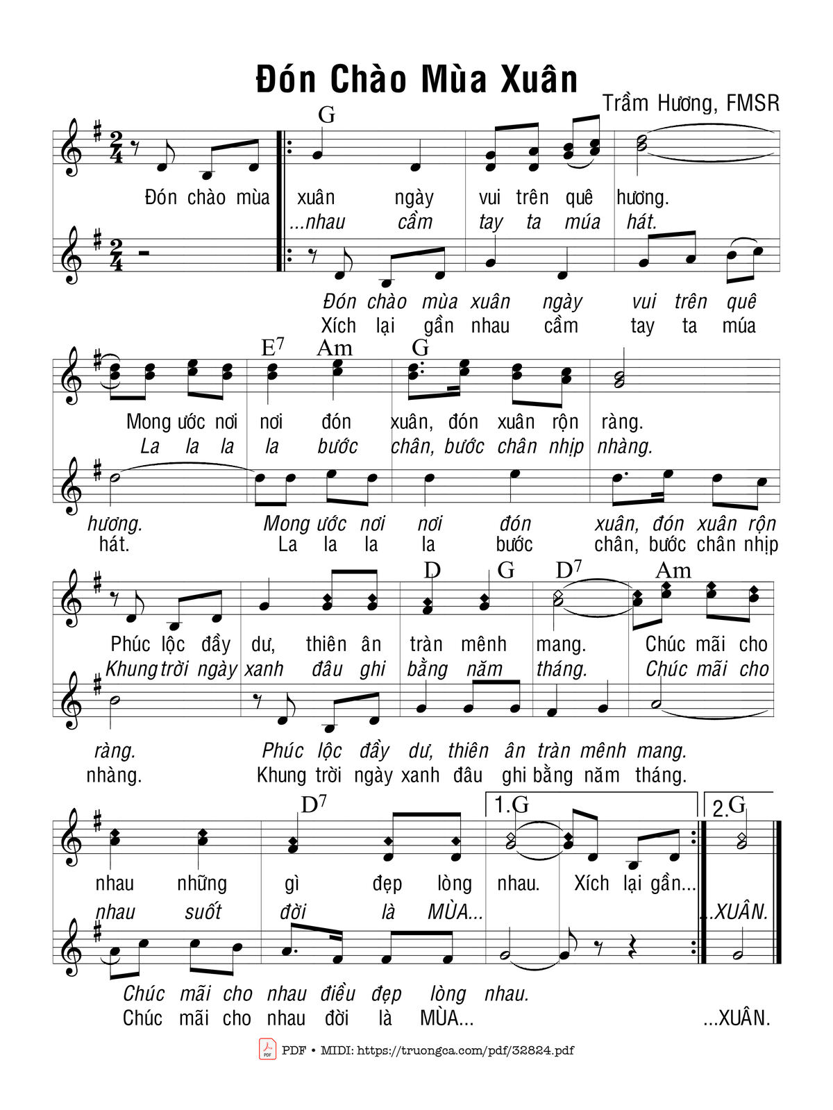 Sheet music Đón Chào Mùa Xuân by Trầm Hương and PDF file was posted here to support you to practice singing perfectly. Sheets with notes and chords are for reference only, for non-commercial purposes only, not involved with earning money by buying and selling. Copyright is belong to song writer/author and copyright owner. Truongca.com do not own any copyrighted content. You can download the high-quality PDF files which contain staffs by PDF link above.