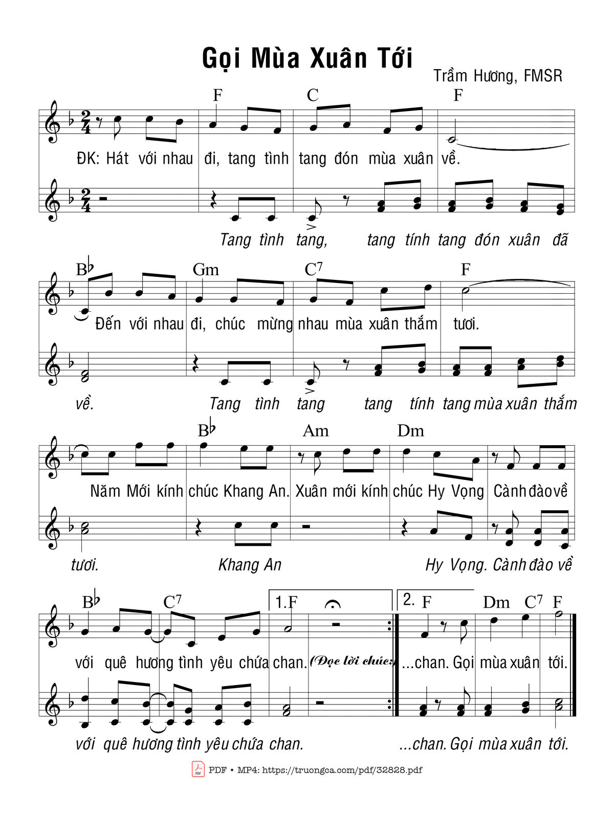 Sheet music Gọi Mùa Xuân Tới by Trầm Hương and PDF file was posted here to support you to practice singing perfectly. Sheets with notes and chords are for reference only, for non-commercial purposes only, not involved with earning money by buying and selling. Copyright is belong to song writer/author and copyright owner. Truongca.com do not own any copyrighted content. You can download the high-quality PDF files which contain staffs by PDF link above.