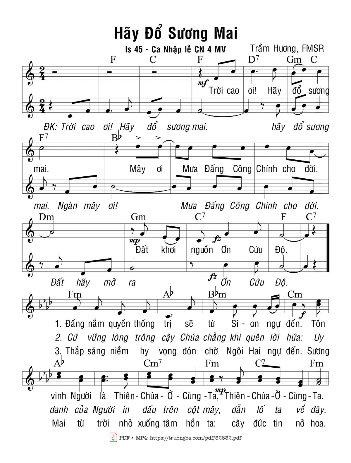 Sheet music Hãy Đổ Sương Mai by Trầm Hương and PDF file was posted here to support you to practice singing perfectly. Sheets with notes and chords are for reference only, for non-commercial purposes only, not involved with earning money by buying and selling. Copyright is belong to song writer/author and copyright owner. Truongca.com do not own any copyrighted content. You can download the high-quality PDF files which contain staffs by PDF link above.