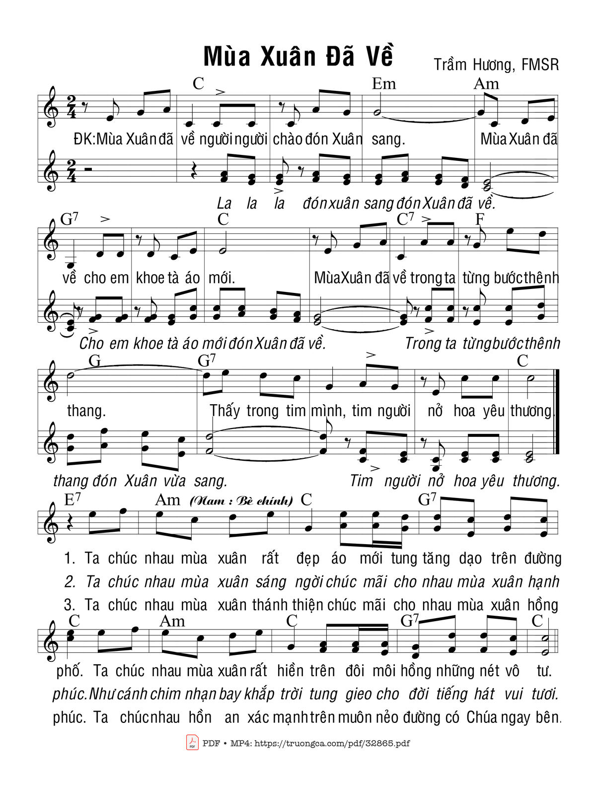 Sheet music Mùa Xuân Đã Về by Trầm Hương and PDF file was posted here to support you to practice singing perfectly. Sheets with notes and chords are for reference only, for non-commercial purposes only, not involved with earning money by buying and selling. Copyright is belong to song writer/author and copyright owner. Truongca.com do not own any copyrighted content. You can download the high-quality PDF files which contain staffs by PDF link above.