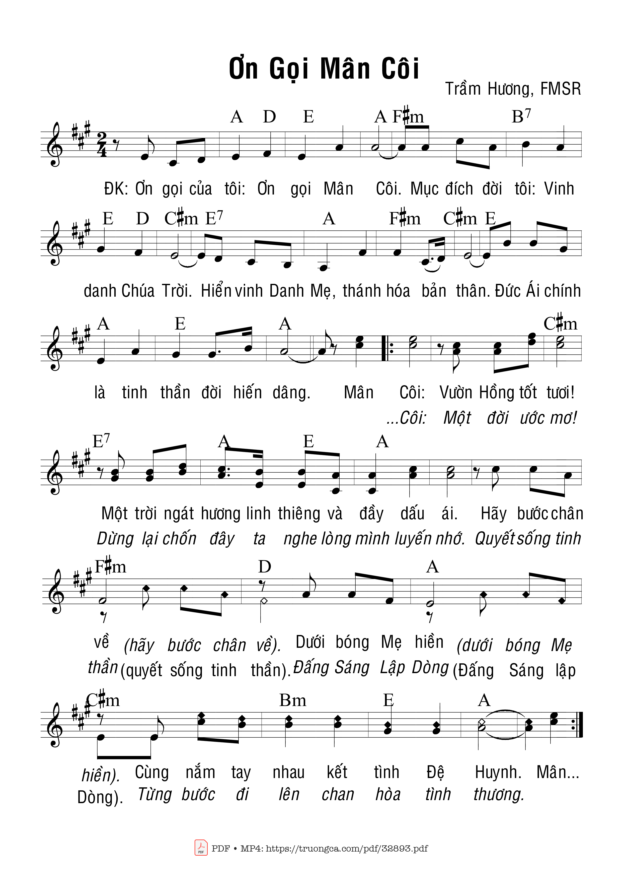 Sheet music Ơn Gọi Mân Côi by Trầm Hương and PDF file was posted here to support you to practice singing perfectly. Sheets with notes and chords are for reference only, for non-commercial purposes only, not involved with earning money by buying and selling. Copyright is belong to song writer/author and copyright owner. Truongca.com do not own any copyrighted content. You can download the high-quality PDF files which contain staffs by PDF link above.