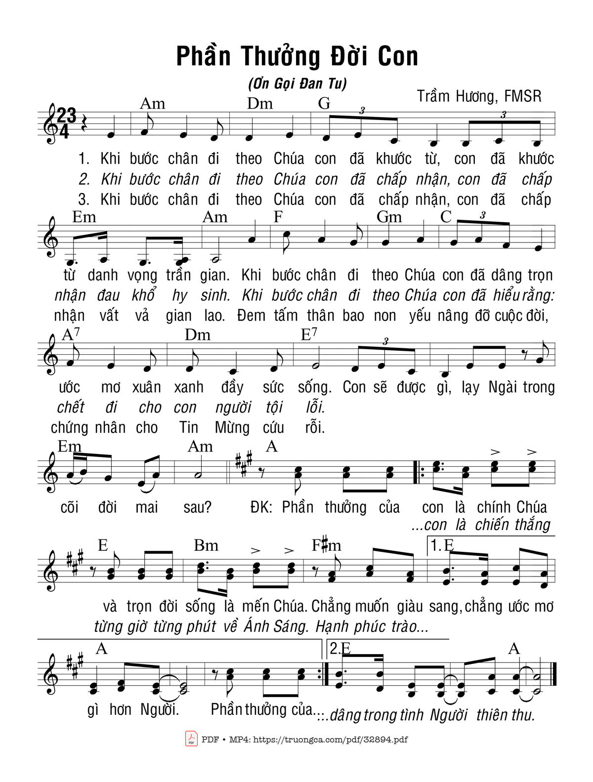Sheet music Phần Thưởng Đời Con by Trầm Hương and PDF file was posted here to support you to practice singing perfectly. Sheets with notes and chords are for reference only, for non-commercial purposes only, not involved with earning money by buying and selling. Copyright is belong to song writer/author and copyright owner. Truongca.com do not own any copyrighted content. You can download the high-quality PDF files which contain staffs by PDF link above.