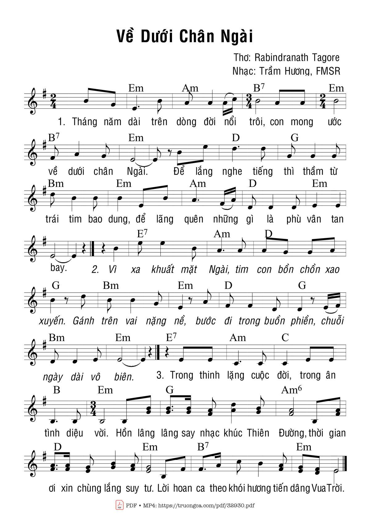 Sheet music Về Dưới Chân Ngài by Trầm Hương and PDF file was posted here to support you to practice singing perfectly. Sheets with notes and chords are for reference only, for non-commercial purposes only, not involved with earning money by buying and selling. Copyright is belong to song writer/author and copyright owner. Truongca.com do not own any copyrighted content. You can download the high-quality PDF files which contain staffs by PDF link above.