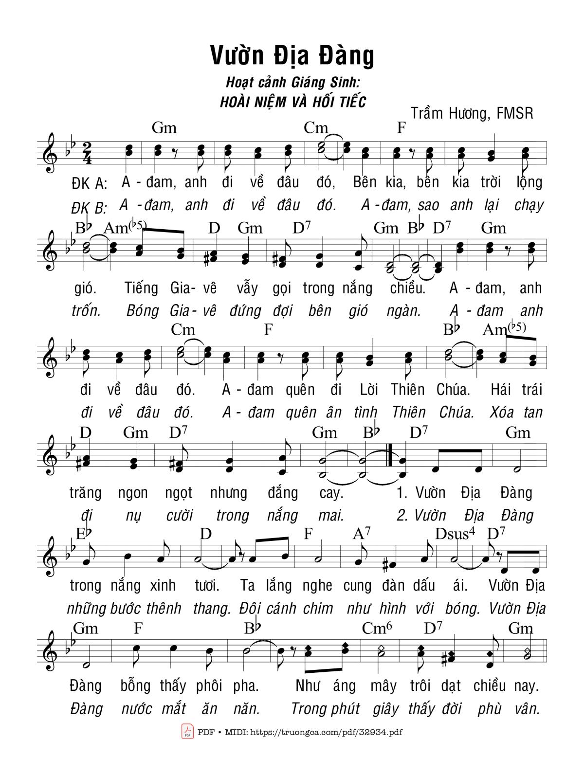 Sheet music Vườn Địa Đàng by Trầm Hương and PDF file was posted here to support you to practice singing perfectly. Sheets with notes and chords are for reference only, for non-commercial purposes only, not involved with earning money by buying and selling. Copyright is belong to song writer/author and copyright owner. Truongca.com do not own any copyrighted content. You can download the high-quality PDF files which contain staffs by PDF link above.