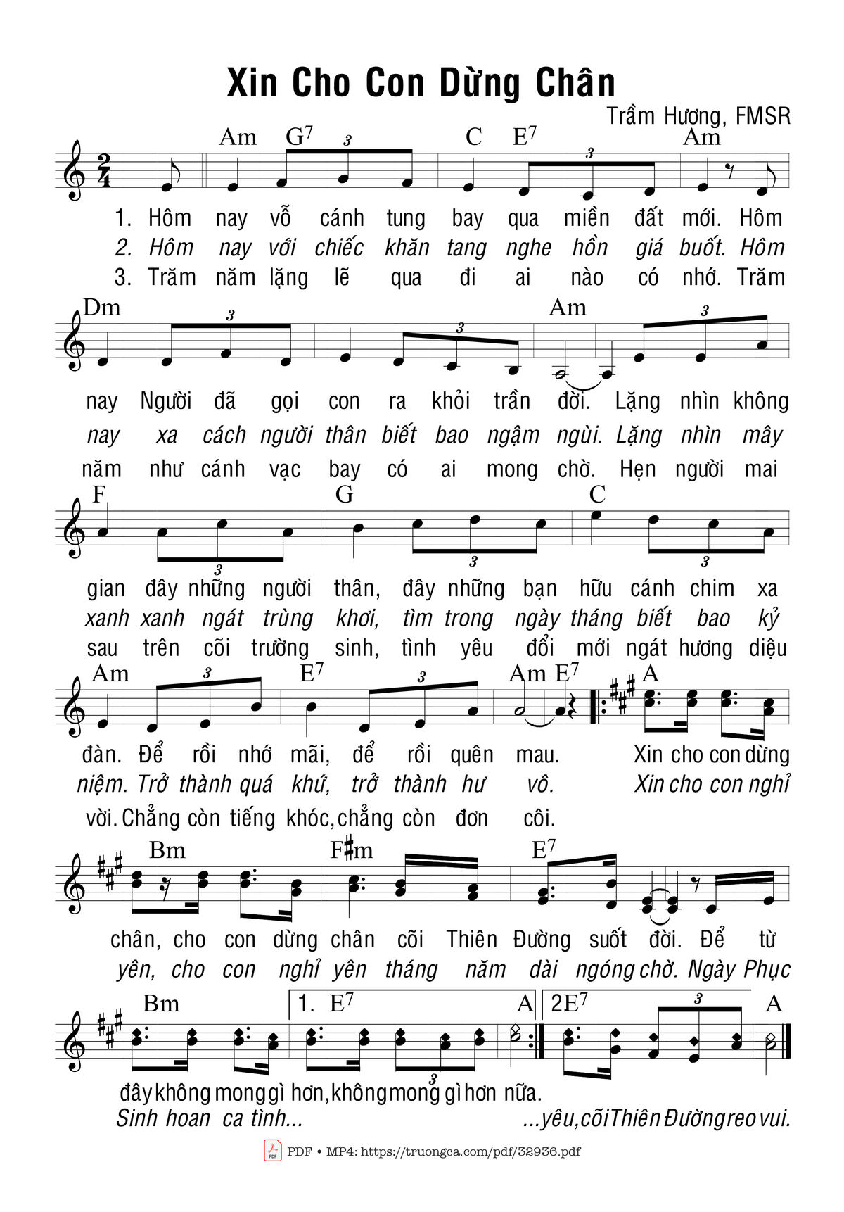 Sheet music Xin Cho Con Dừng Chân by Trầm Hương and PDF file was posted here to support you to practice singing perfectly. Sheets with notes and chords are for reference only, for non-commercial purposes only, not involved with earning money by buying and selling. Copyright is belong to song writer/author and copyright owner. Truongca.com do not own any copyrighted content. You can download the high-quality PDF files which contain staffs by PDF link above.