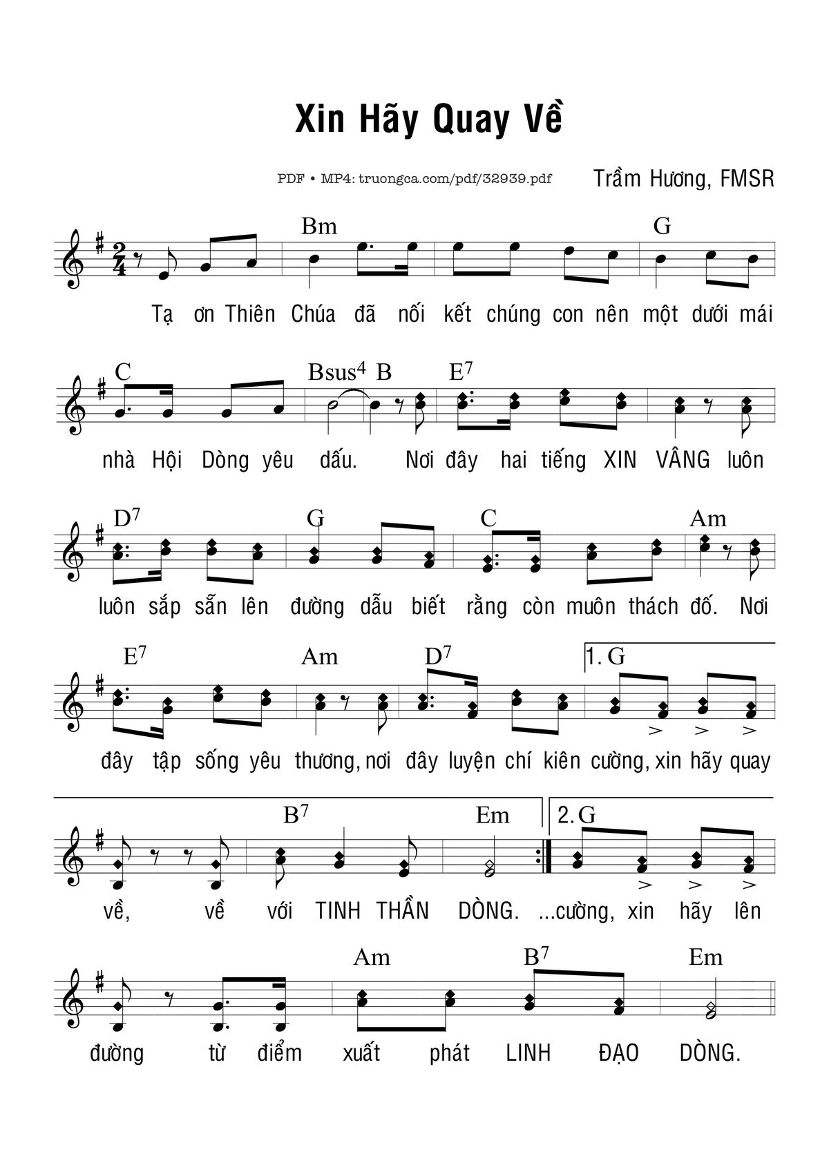 Transposition is the process of moving a song's melody and chords up or down in pitch by a constant interval. The direction of the transposition tool is indicated by a plus (+) sign for up and a minus (-) sign for down. Hover mouse over chords signs to see the chords chart of Xin Hãy Quay Về song.