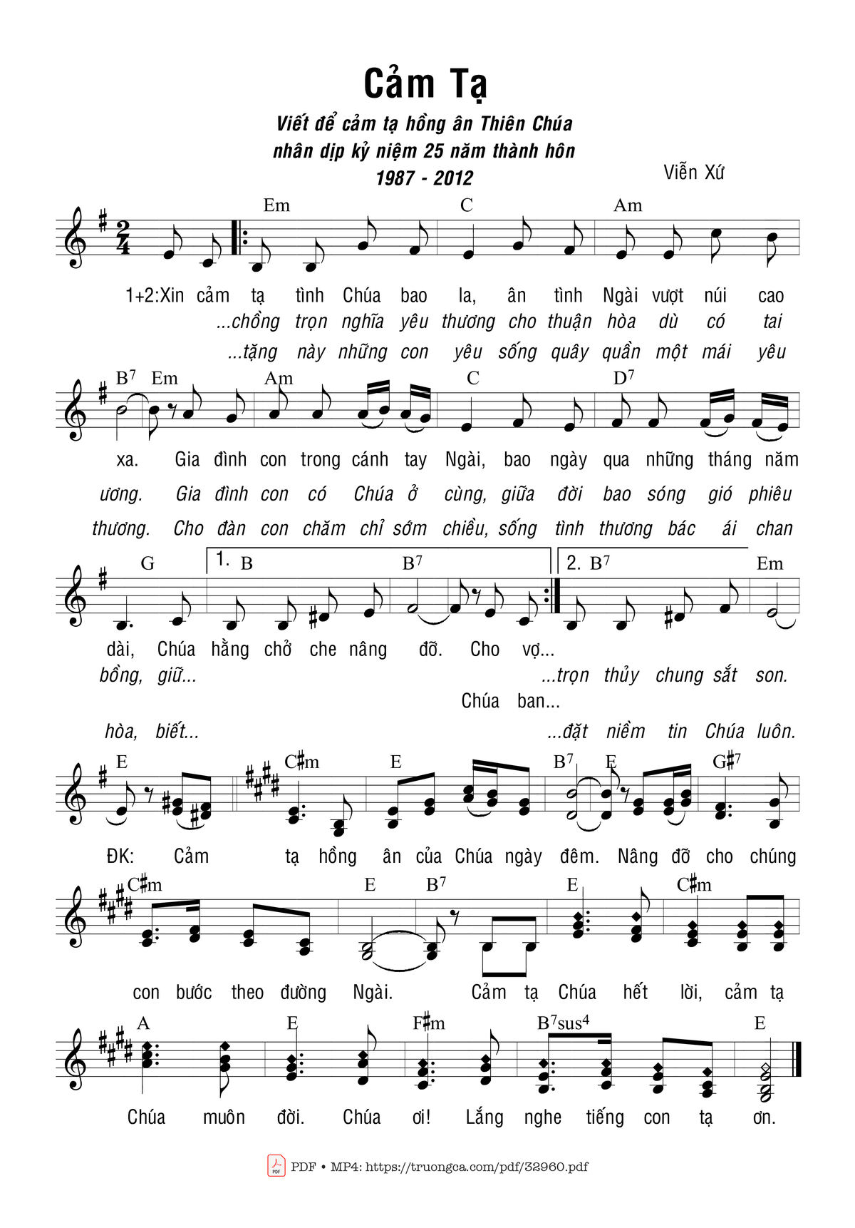Transposition is the process of moving a song's melody and chords up or down in pitch by a constant interval. The direction of the transposition tool is indicated by a plus (+) sign for up and a minus (-) sign for down. Hover mouse over chords signs to see the chords chart of Cảm Tạ song.