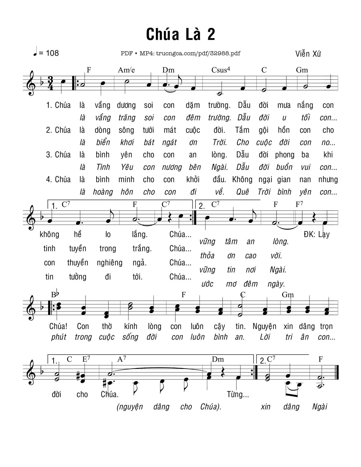 Transposition is the process of moving a song's melody and chords up or down in pitch by a constant interval. The direction of the transposition tool is indicated by a plus (+) sign for up and a minus (-) sign for down. Hover mouse over chords signs to see the chords chart of Chúa Là 2 song.