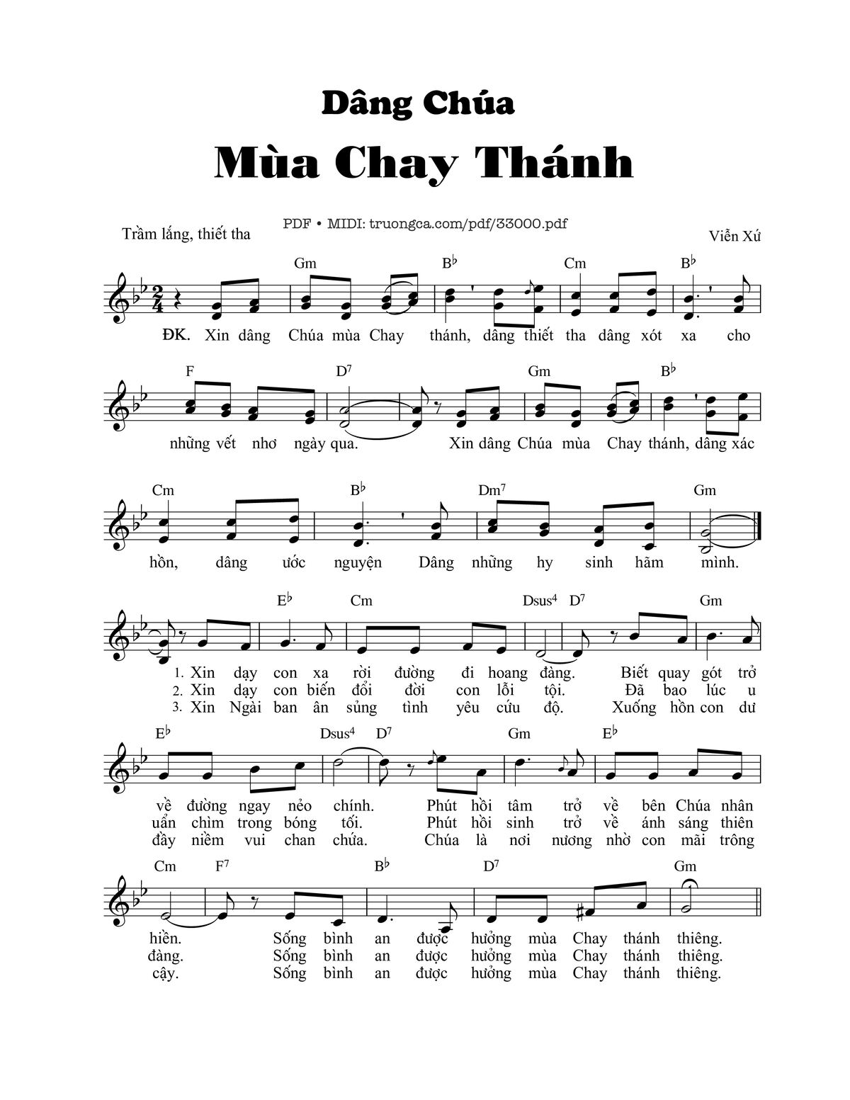 Transposition is the process of moving a song's melody and chords up or down in pitch by a constant interval. The direction of the transposition tool is indicated by a plus (+) sign for up and a minus (-) sign for down. Hover mouse over chords signs to see the chords chart of Dâng Chúa Mùa Chay Thánh song.