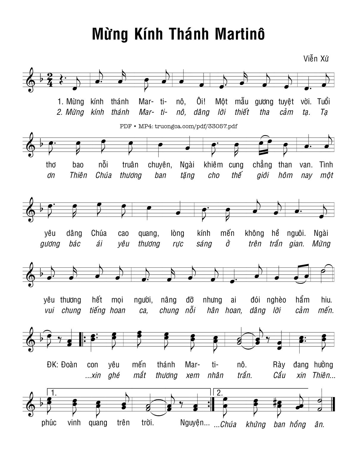 Sheet music Mừng Kính Thánh Martinô by Viễn Xứ and PDF file was posted here to support you to practice singing perfectly. Sheets with notes and chords are for reference only, for non-commercial purposes only, not involved with earning money by buying and selling. Copyright is belong to song writer/author and copyright owner. Truongca.com do not own any copyrighted content. You can download the high-quality PDF files which contain staffs by PDF link above.