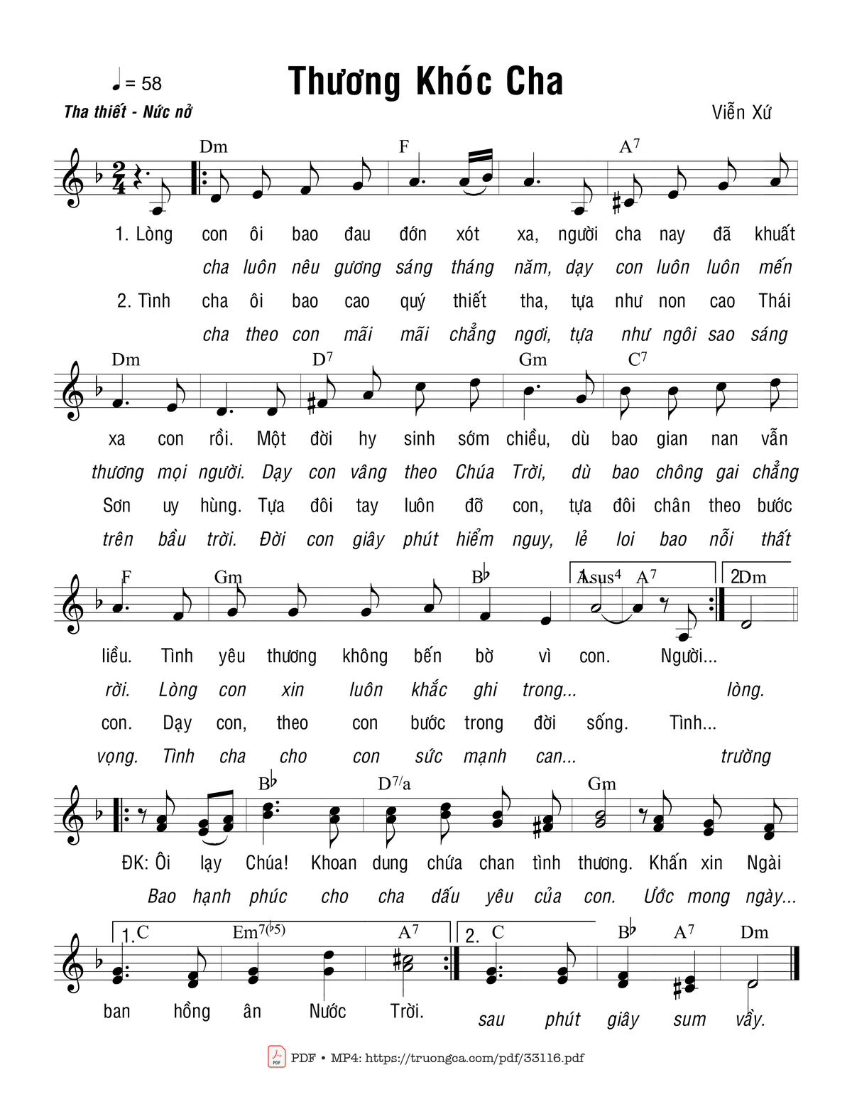 Transposition is the process of moving a song's melody and chords up or down in pitch by a constant interval. The direction of the transposition tool is indicated by a plus (+) sign for up and a minus (-) sign for down. Hover mouse over chords signs to see the chords chart of Thương Khóc Cha song.