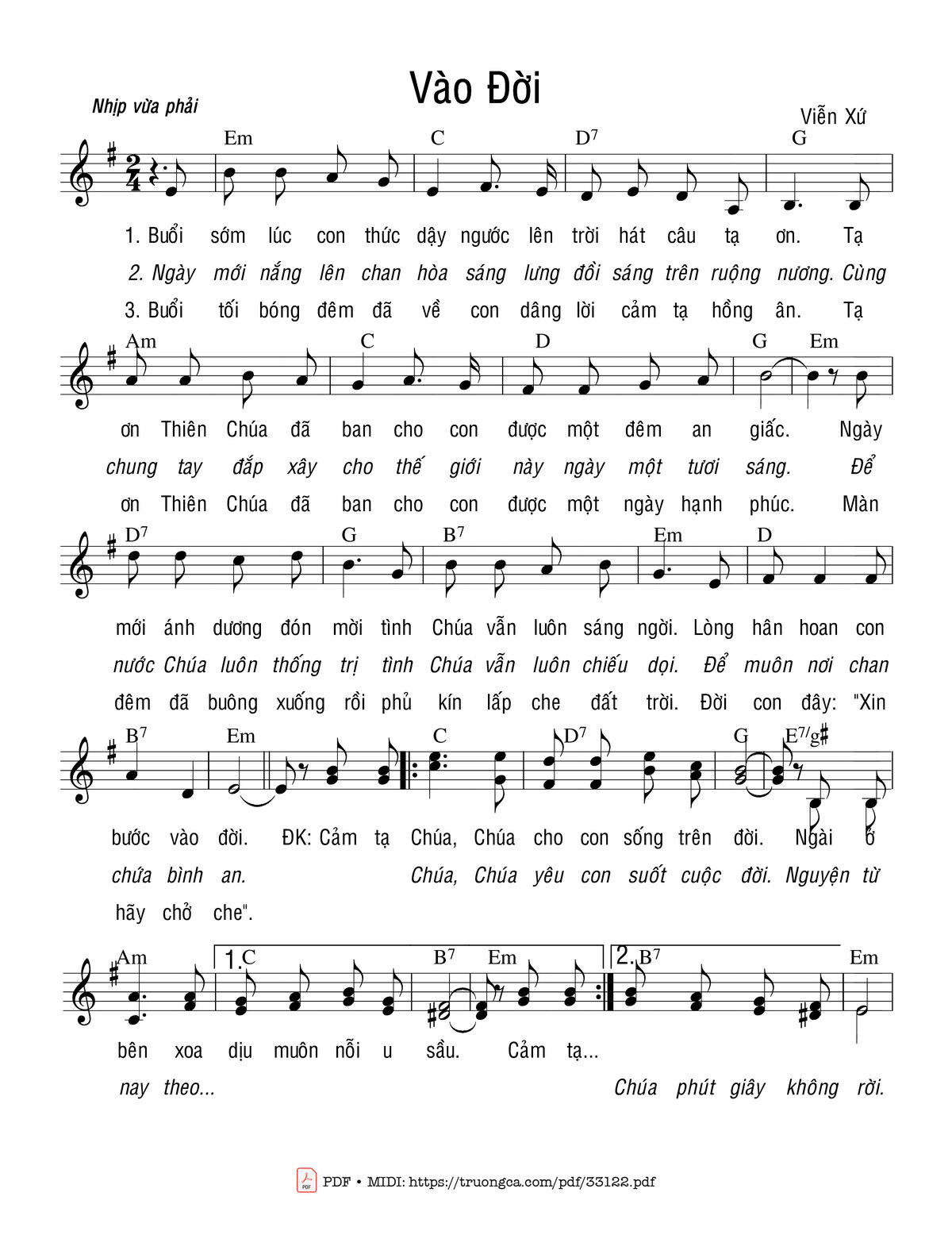 Transposition is the process of moving a song's melody and chords up or down in pitch by a constant interval. The direction of the transposition tool is indicated by a plus (+) sign for up and a minus (-) sign for down. Hover mouse over chords signs to see the chords chart of Vào Đời song.