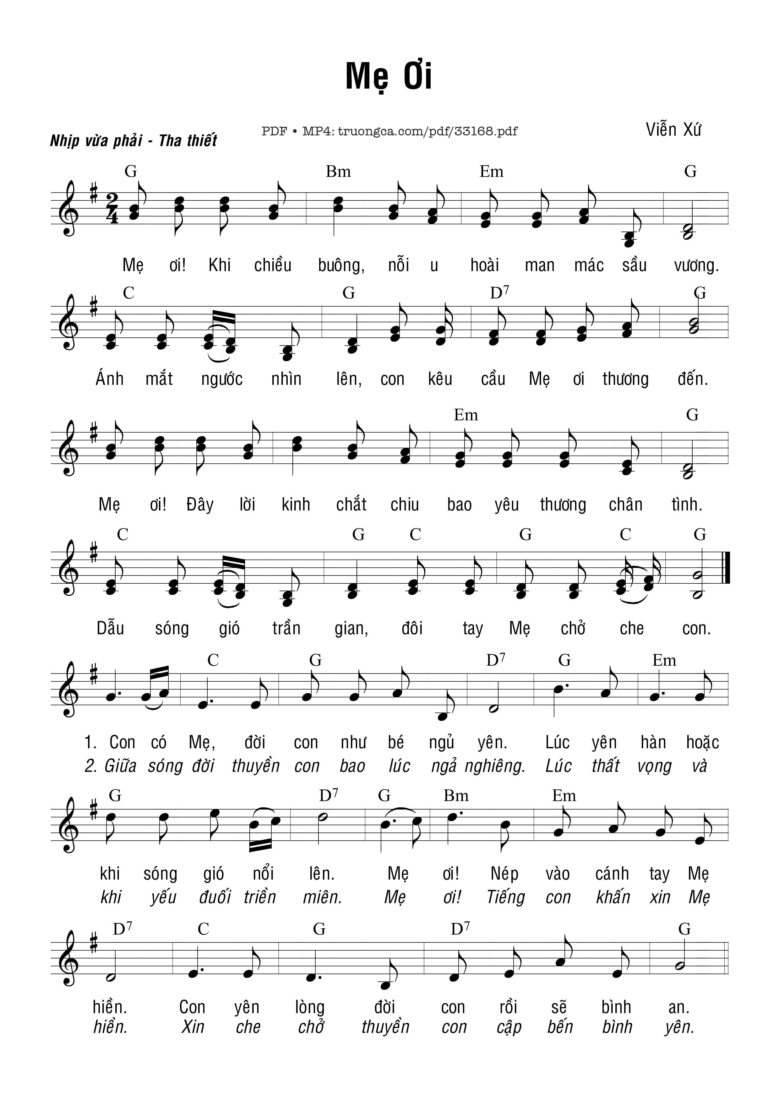 Transposition is the process of moving a song's melody and chords up or down in pitch by a constant interval. The direction of the transposition tool is indicated by a plus (+) sign for up and a minus (-) sign for down. Hover mouse over chords signs to see the chords chart of Mẹ Ơi! song.