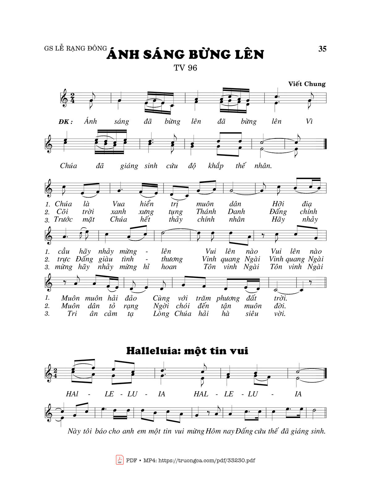Sheet music Thánh Vịnh 96, Ánh Sáng Bừng Lên by Viết Chung and PDF file was posted here to support you to practice singing perfectly. Sheets with notes and chords are for reference only, for non-commercial purposes only, not involved with earning money by buying and selling. Copyright is belong to song writer/author and copyright owner. Truongca.com do not own any copyrighted content. You can download the high-quality PDF files which contain staffs by PDF link above.