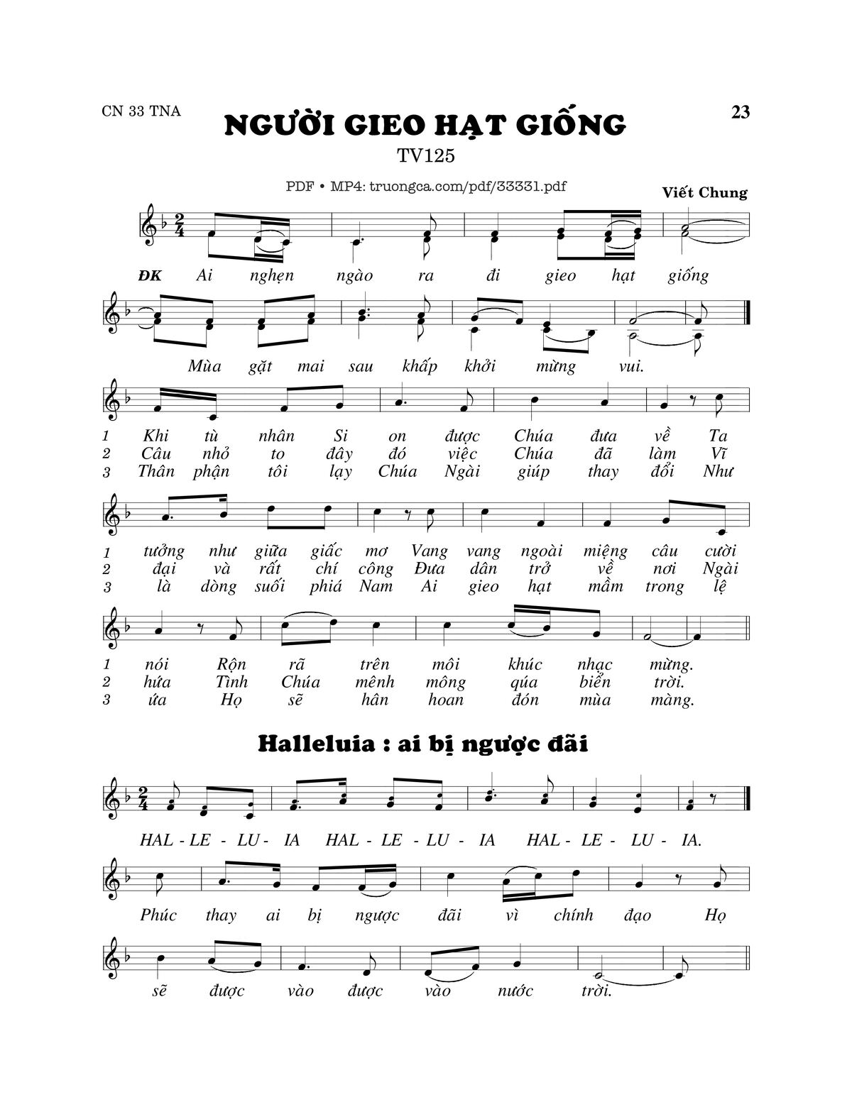 Sheet music Thánh Vịnh 123, Người Gieo Hạt Giống by Viết Chung and PDF file was posted here to support you to practice singing perfectly. Sheets with notes and chords are for reference only, for non-commercial purposes only, not involved with earning money by buying and selling. Copyright is belong to song writer/author and copyright owner. Truongca.com do not own any copyrighted content. You can download the high-quality PDF files which contain staffs by PDF link above.