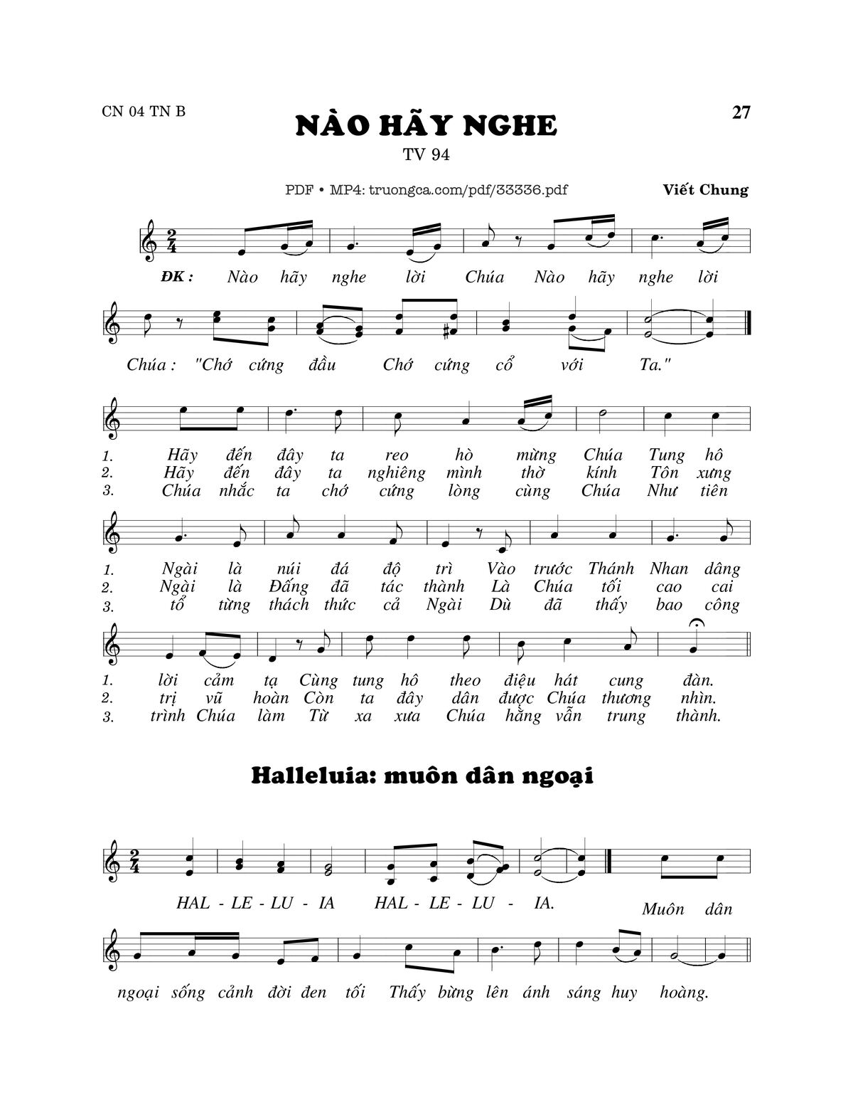 Sheet music Thánh Vịnh 94, Nào Hãy Nghe by Viết Chung and PDF file was posted here to support you to practice singing perfectly. Sheets with notes and chords are for reference only, for non-commercial purposes only, not involved with earning money by buying and selling. Copyright is belong to song writer/author and copyright owner. Truongca.com do not own any copyrighted content. You can download the high-quality PDF files which contain staffs by PDF link above.