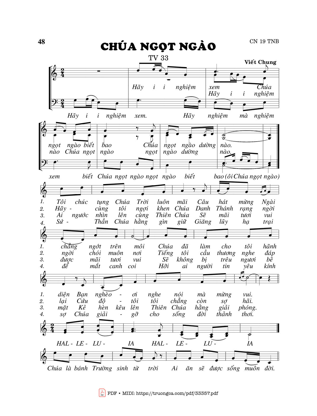 Sheet music Thánh Vịnh 33, Chúa Ngọt Ngào by Viết Chung and PDF file was posted here to support you to practice singing perfectly. Sheets with notes and chords are for reference only, for non-commercial purposes only, not involved with earning money by buying and selling. Copyright is belong to song writer/author and copyright owner. Truongca.com do not own any copyrighted content. You can download the high-quality PDF files which contain staffs by PDF link above.