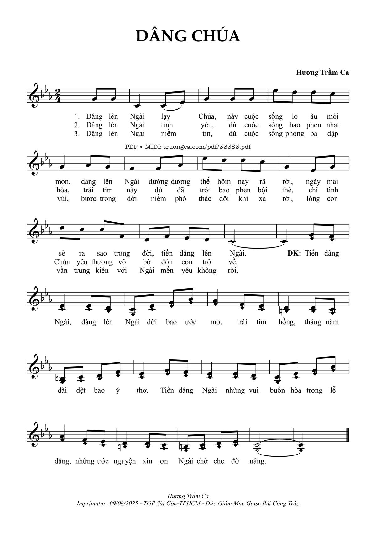 Transposition is the process of moving a song's melody and chords up or down in pitch by a constant interval. The direction of the transposition tool is indicated by a plus (+) sign for up and a minus (-) sign for down. Hover mouse over chords signs to see the chords chart of Dâng Chúa song.