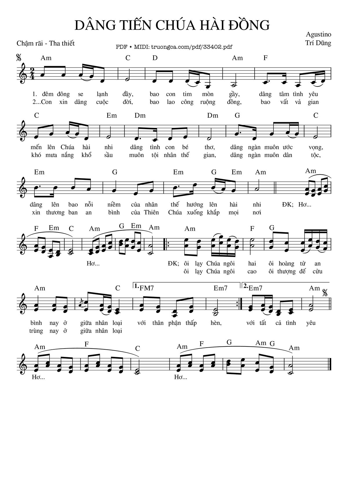 Transposition is the process of moving a song's melody and chords up or down in pitch by a constant interval. The direction of the transposition tool is indicated by a plus (+) sign for up and a minus (-) sign for down. Hover mouse over chords signs to see the chords chart of Dâng Tiến Chúa Hài Đồng song.