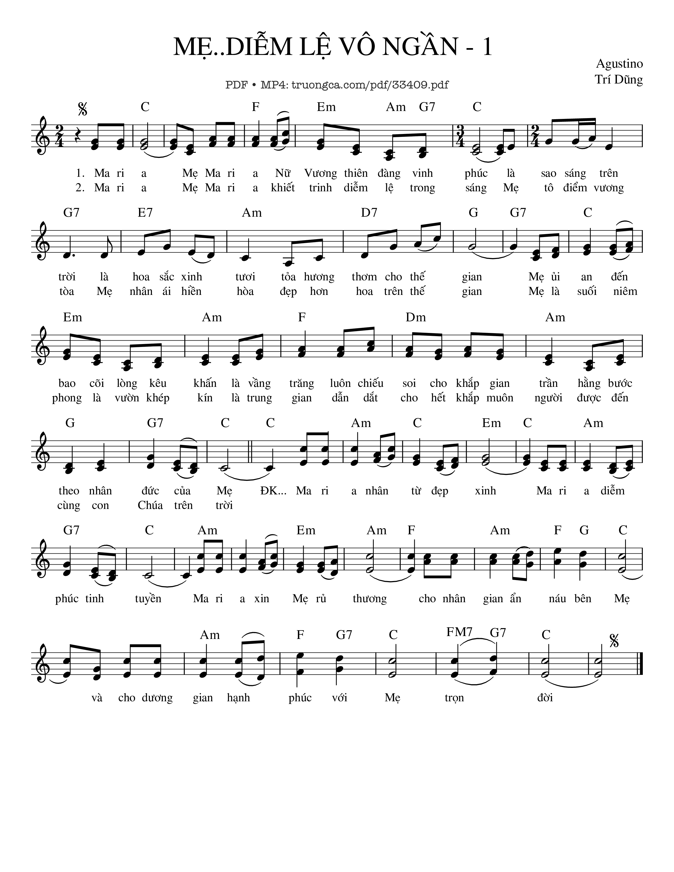 Transposition is the process of moving a song's melody and chords up or down in pitch by a constant interval. The direction of the transposition tool is indicated by a plus (+) sign for up and a minus (-) sign for down. Hover mouse over chords signs to see the chords chart of Mẹ Diễm Lệ Vô Ngần 1 song.