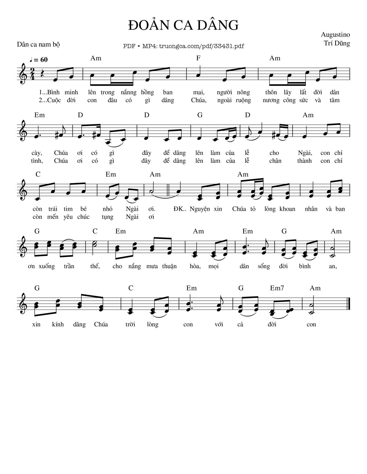 Transposition is the process of moving a song's melody and chords up or down in pitch by a constant interval. The direction of the transposition tool is indicated by a plus (+) sign for up and a minus (-) sign for down. Hover mouse over chords signs to see the chords chart of Đoản Ca Dâng song.